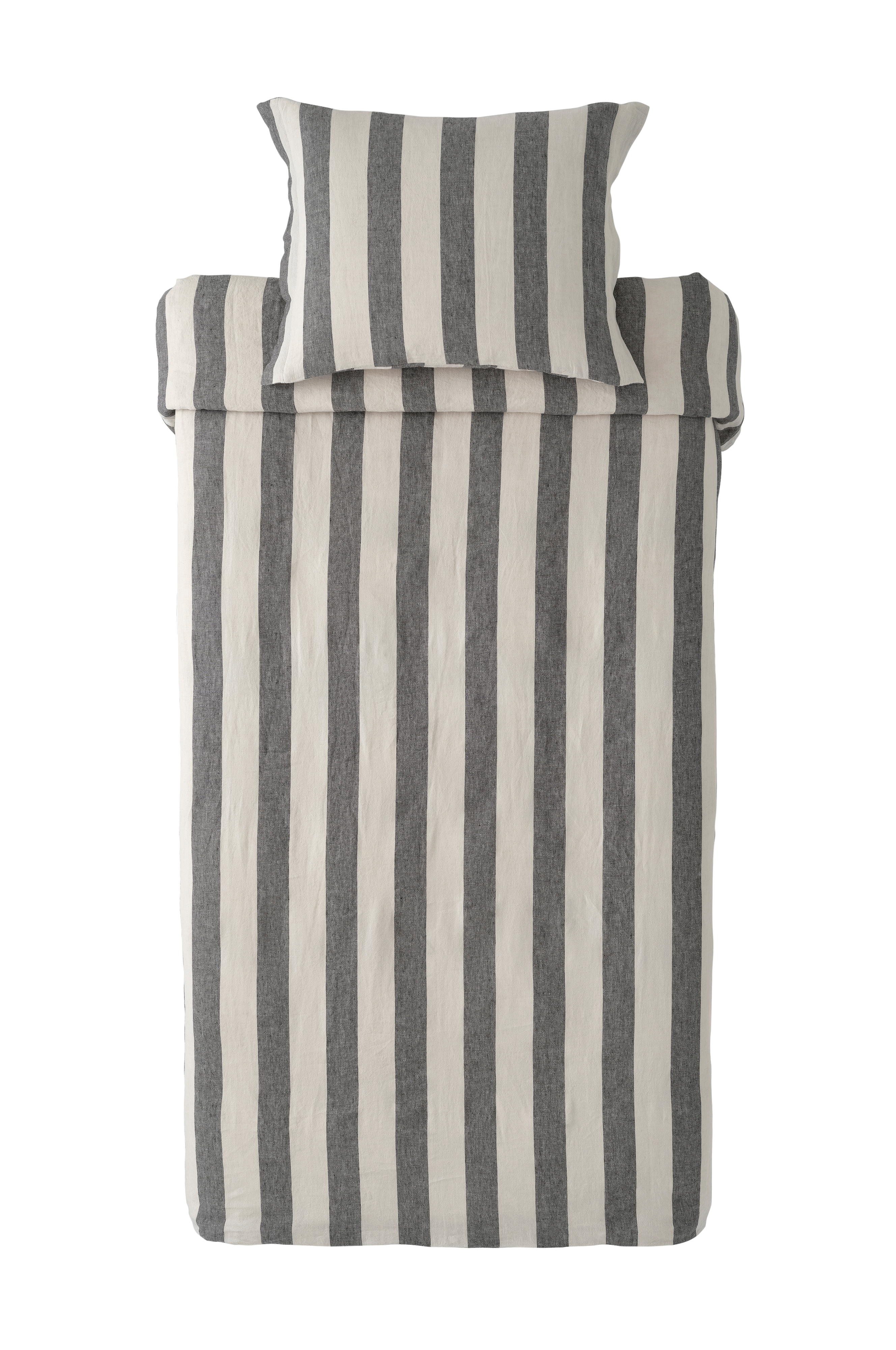 Pussilakanasetti pestyä ranskalaista pellavaa. Lankavärjätyt raidat. Painonapit pussilakanan alareunassa. Ei kädenaukkoja. Tyynyliinassa 5 cm:n reunus lyhyillä sivuilla. Setissä 1 pussilakana 150x200 cm (kapean sängyn peittoon) ja 1 tyynyliina 50x60 cm + reunus.