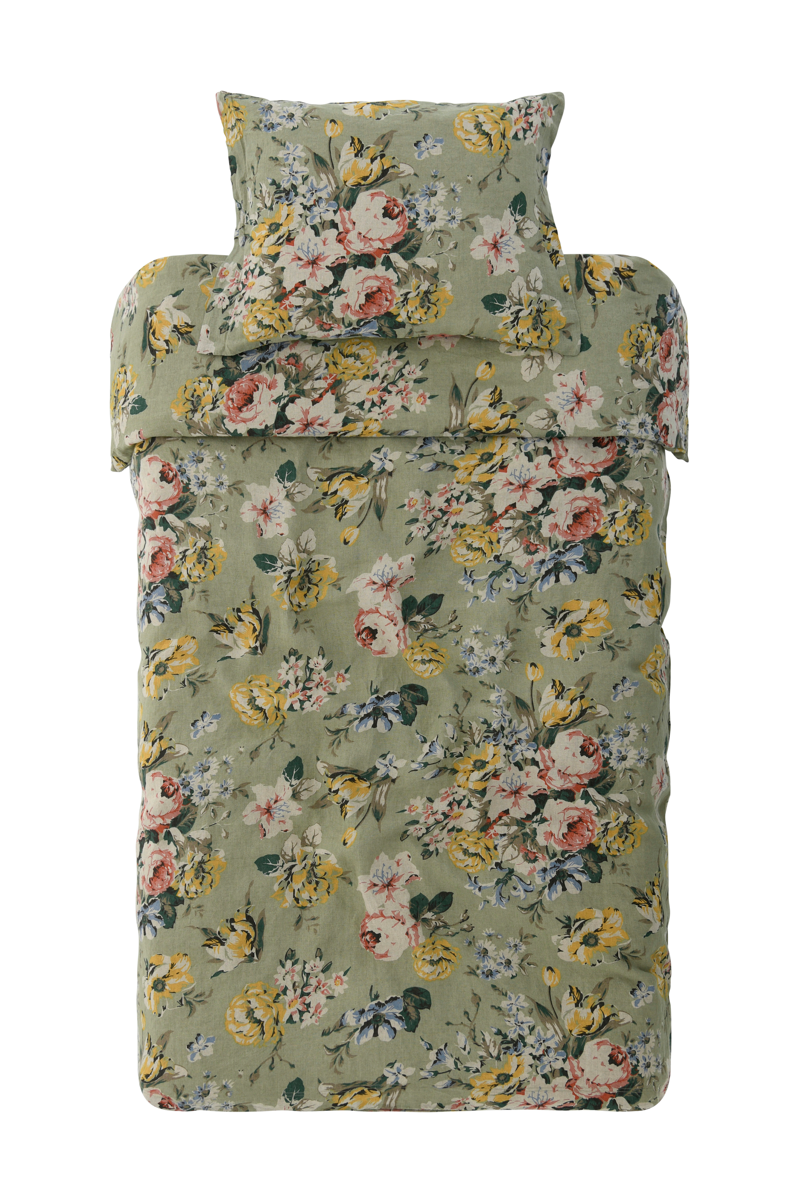 Pussilakanasetti vintagepestyä ranskalaista pellavaa. Painettu ruusukuvio pellavapohjalla. Painonapit pussilakanan alareunassa. Ei kädenaukkoja. Tyynyliinassa 5 cm:n reunus lyhyillä sivuilla. Setissä 1 pussilakana 150x200 cm (kapean sängyn peittoon) ja 1 tyynyliina 50x60 cm + reunus.