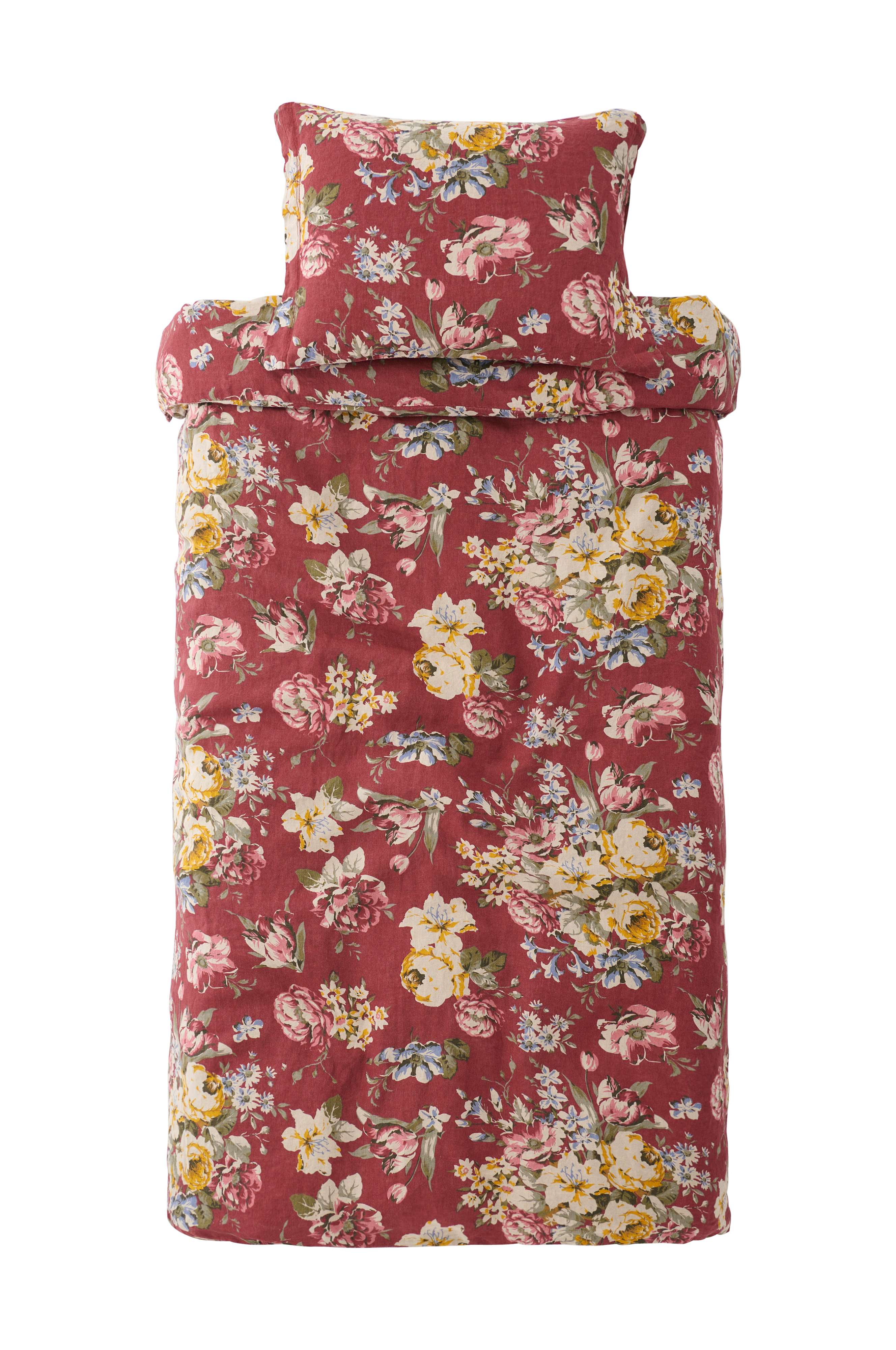 Pussilakanasetti vintagepestyä ranskalaista pellavaa. Painettu ruusukuvio pellavapohjalla. Painonapit pussilakanan alareunassa. Ei kädenaukkoja. Tyynyliinassa 5 cm:n reunus lyhyillä sivuilla. Setissä 1 pussilakana 150x200 cm (kapean sängyn peittoon) ja 1 tyynyliina 50x60 cm + reunus.