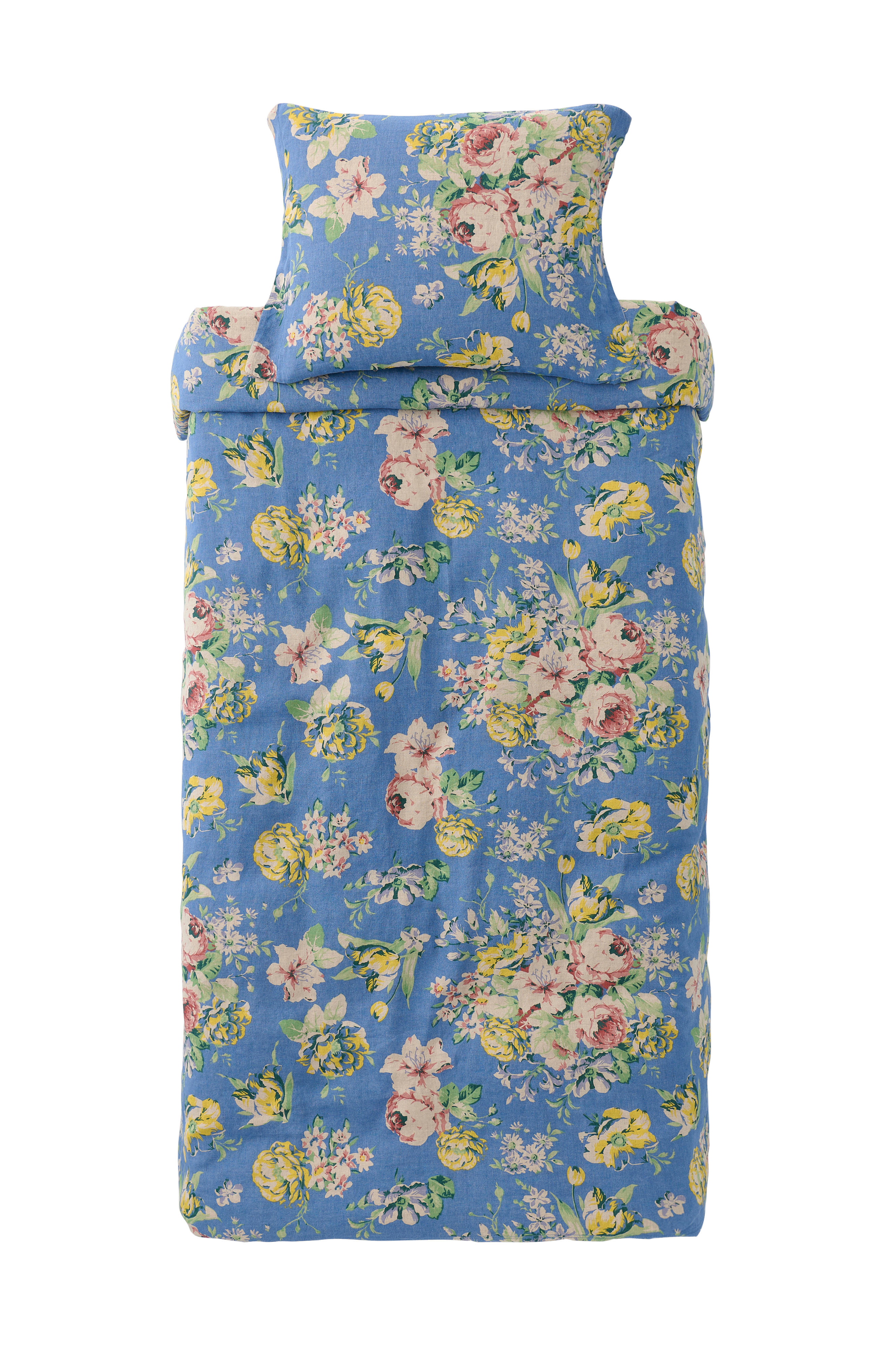 Pussilakanasetti vintagepestyä ranskalaista pellavaa. Painettu ruusukuvio pellavapohjalla. Painonapit pussilakanan alareunassa. Ei kädenaukkoja. Tyynyliinassa 5 cm:n reunus lyhyillä sivuilla. Setissä 1 pussilakana 150x200 cm (kapean sängyn peittoon) ja 1 tyynyliina 50x60 cm + reunus.