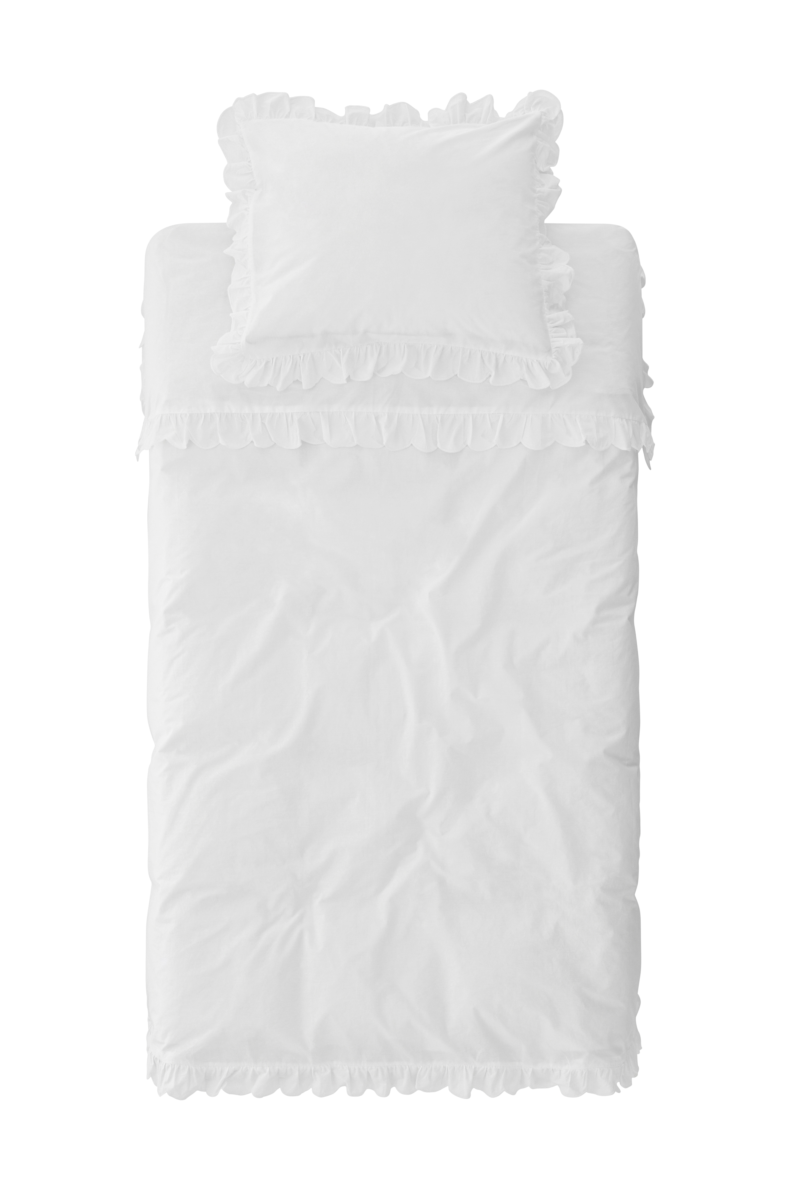 2- tai 3-osainen pussilakanasetti pestyä puuvillaperkaalia. 6 cm:n aaltomainen röyhelöreuna ympäriinsä sekä pussilakanassa että tyynyliinassa. Koristeellinen ommel viimeistelee ilmeen. Painonapit pussilakanan alareunassa. Ei kädenaukkoja. Langantiheys 200 tc. Setti toimitetaan samasta materiaalista valmistetussa kangaskassissa.