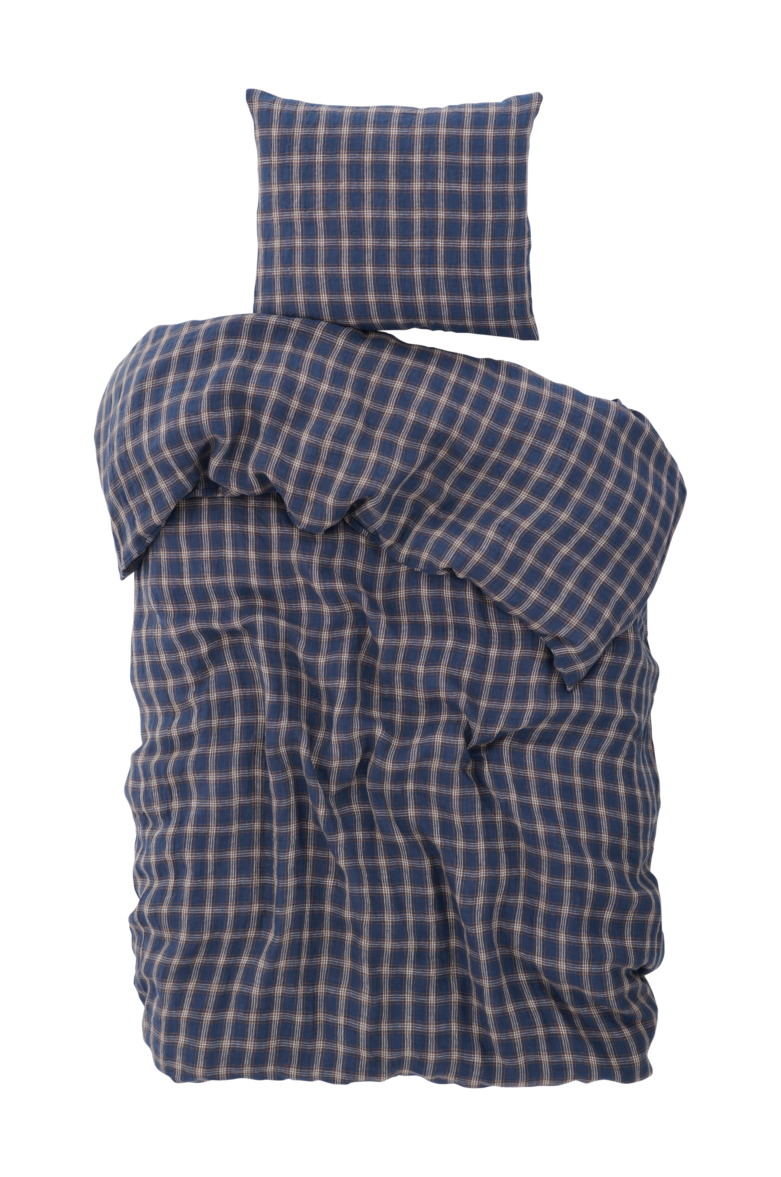 Pussilakanasetti pestyä ranskalaista pellavaa. Lankavärjätyt ruudut. Painonapit pussilakanan alareunassa. Ei kädenaukkoja. Setti toimitetaan samasta materiaalista valmistetussa kangaspussissa, jossa on sama kuvio. Pussilakana 150x210 cm ja tyynyliina 50x60 cm.