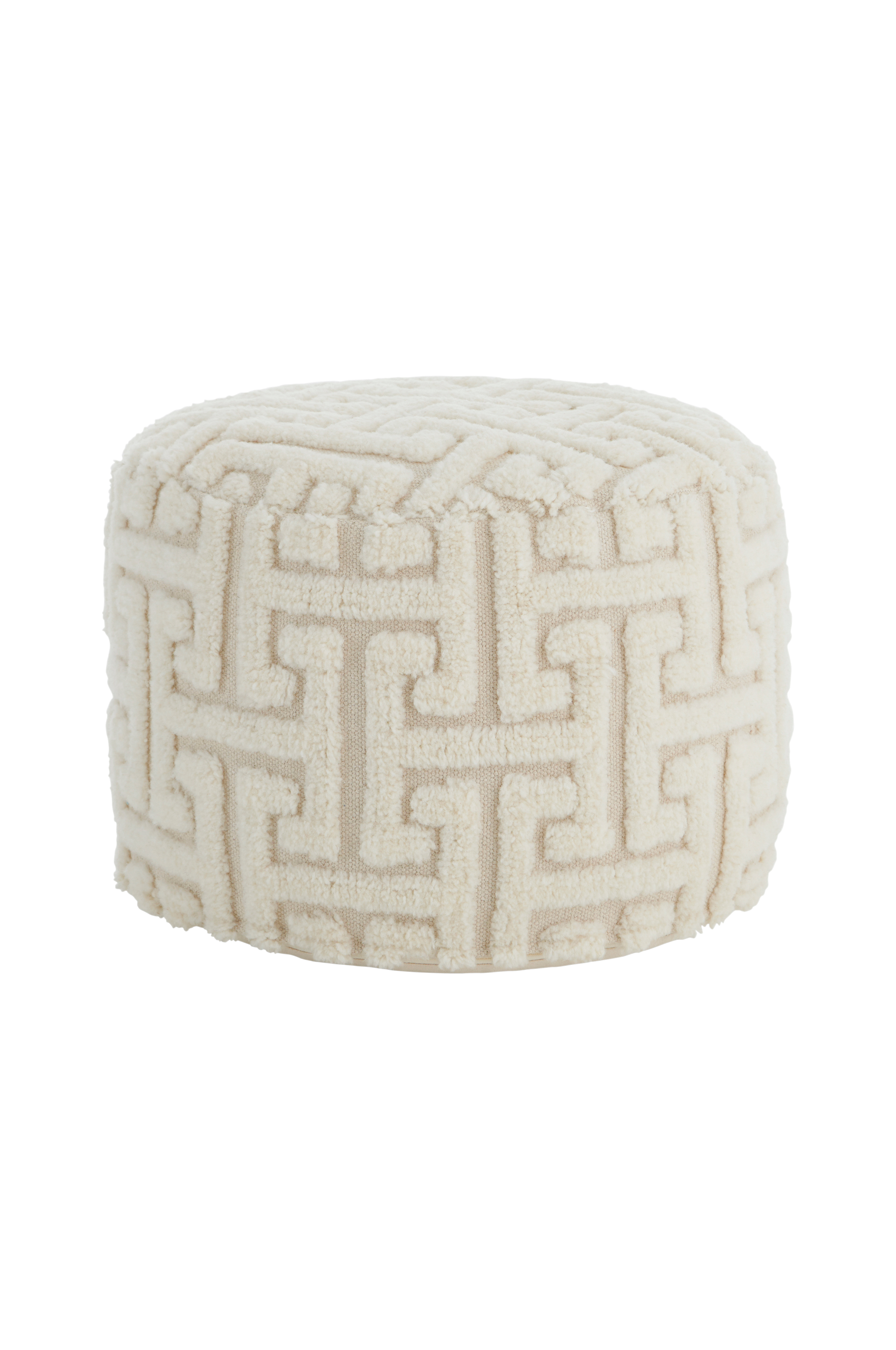 Rahi paksua puuvillaa. Tuftattu kuvio villaa. Täytteenä styroxpalloja (thermocol).