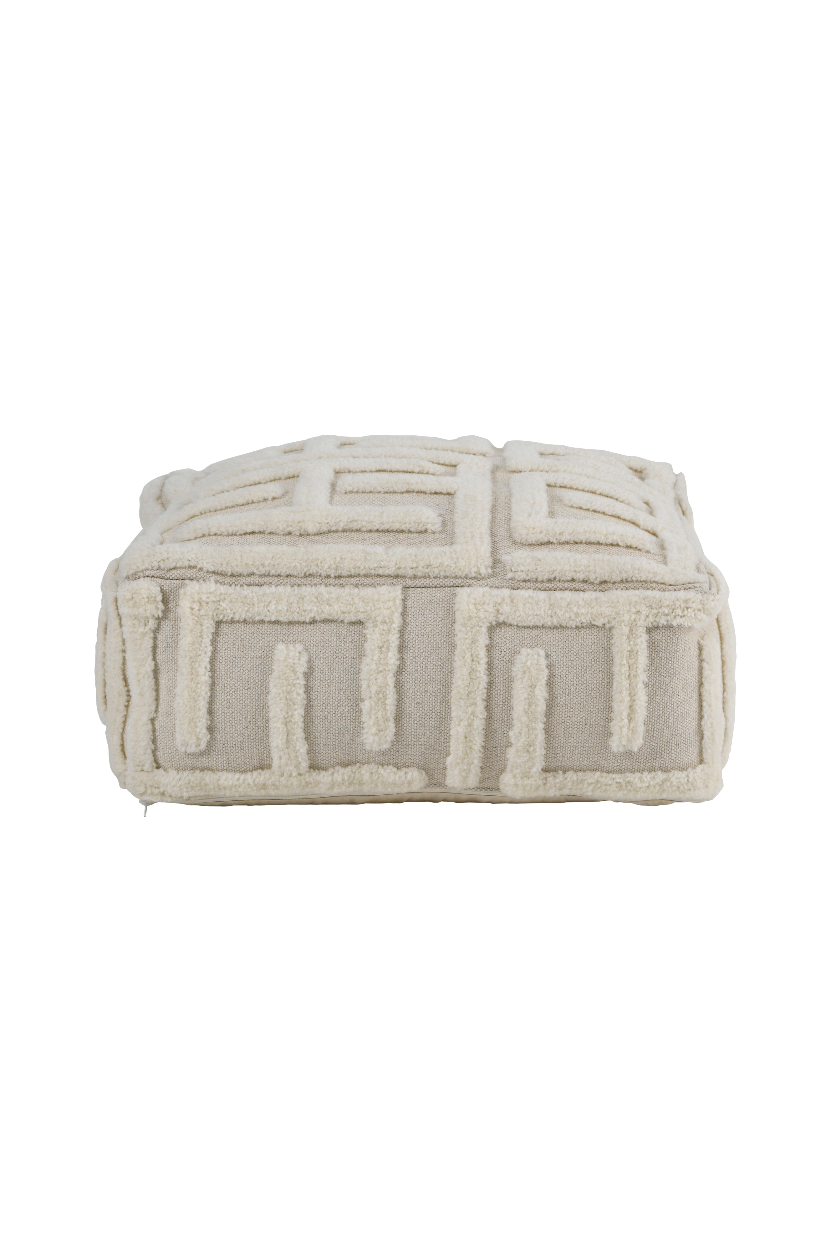 Rahi, jonka tuftattu kuvio. 70% puuvillaa ja 30% villaa. Pohja ja tausta puuvillaa. Täytteenä styroxpalloja (thermocol). Päällisen voi irrottaa pesua varten (pestävä käsin vetoketjun vaurioitumisen ehkäisemiseksi).