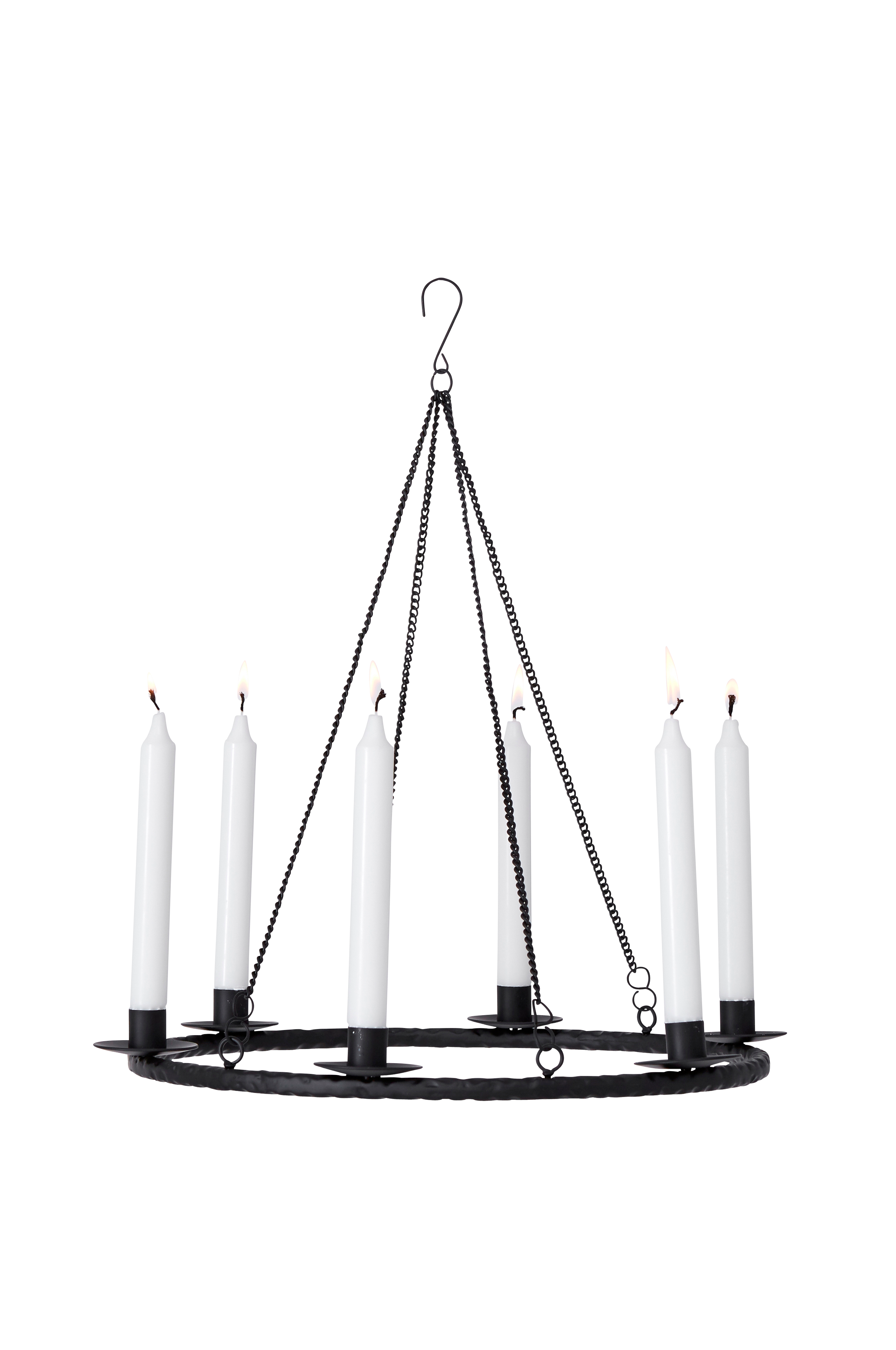 6 kynttilän kynttiläkruunu metallia. ø n. 40 cm. Ketjun pituus n. 49 cm. Steariinikynttilöitä suositellaan.