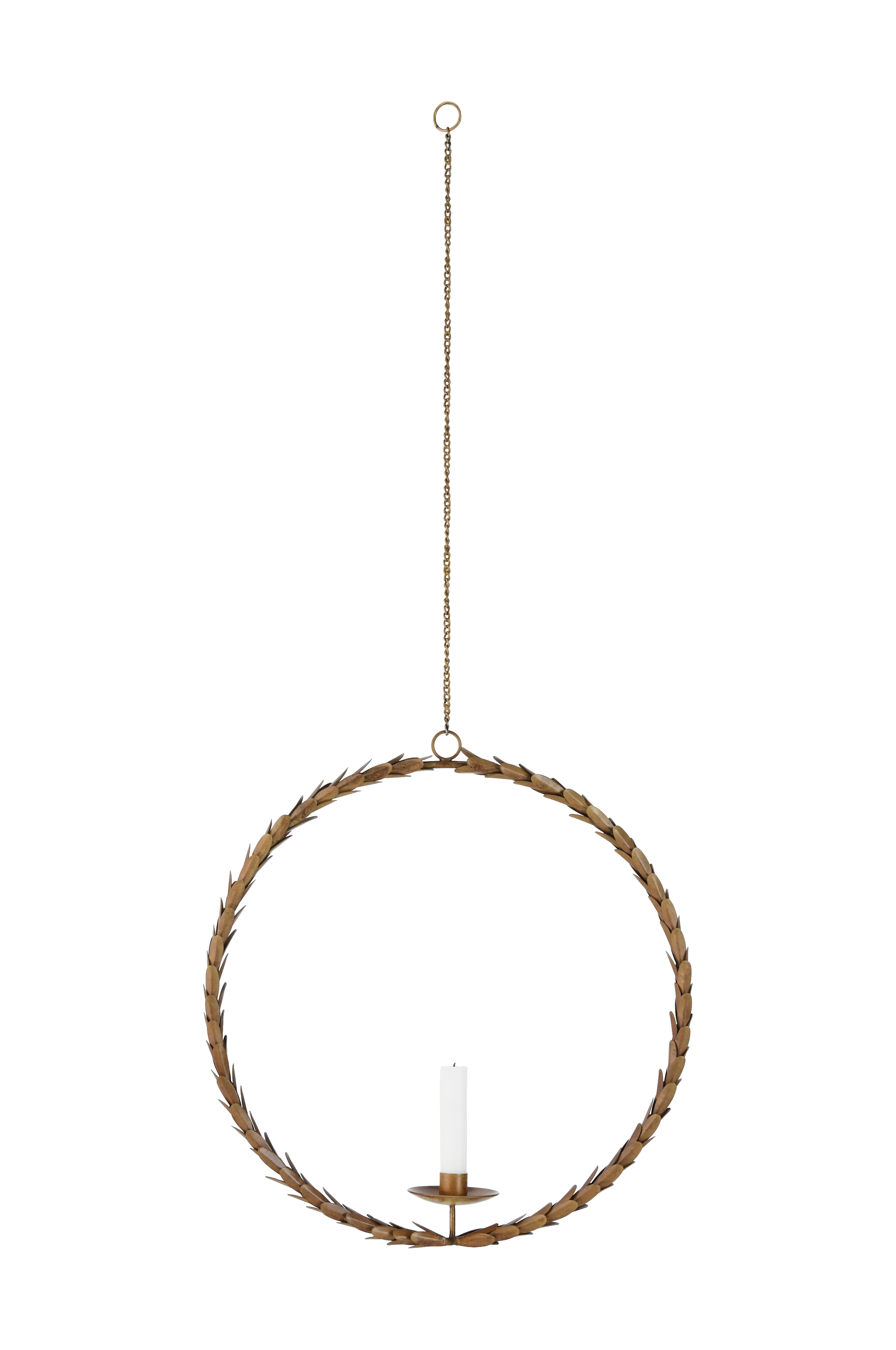 Riippuva metallinen kynttilänjalka. Renkaan halkaisija 40 cm. Ketjun pituus 54 cm.