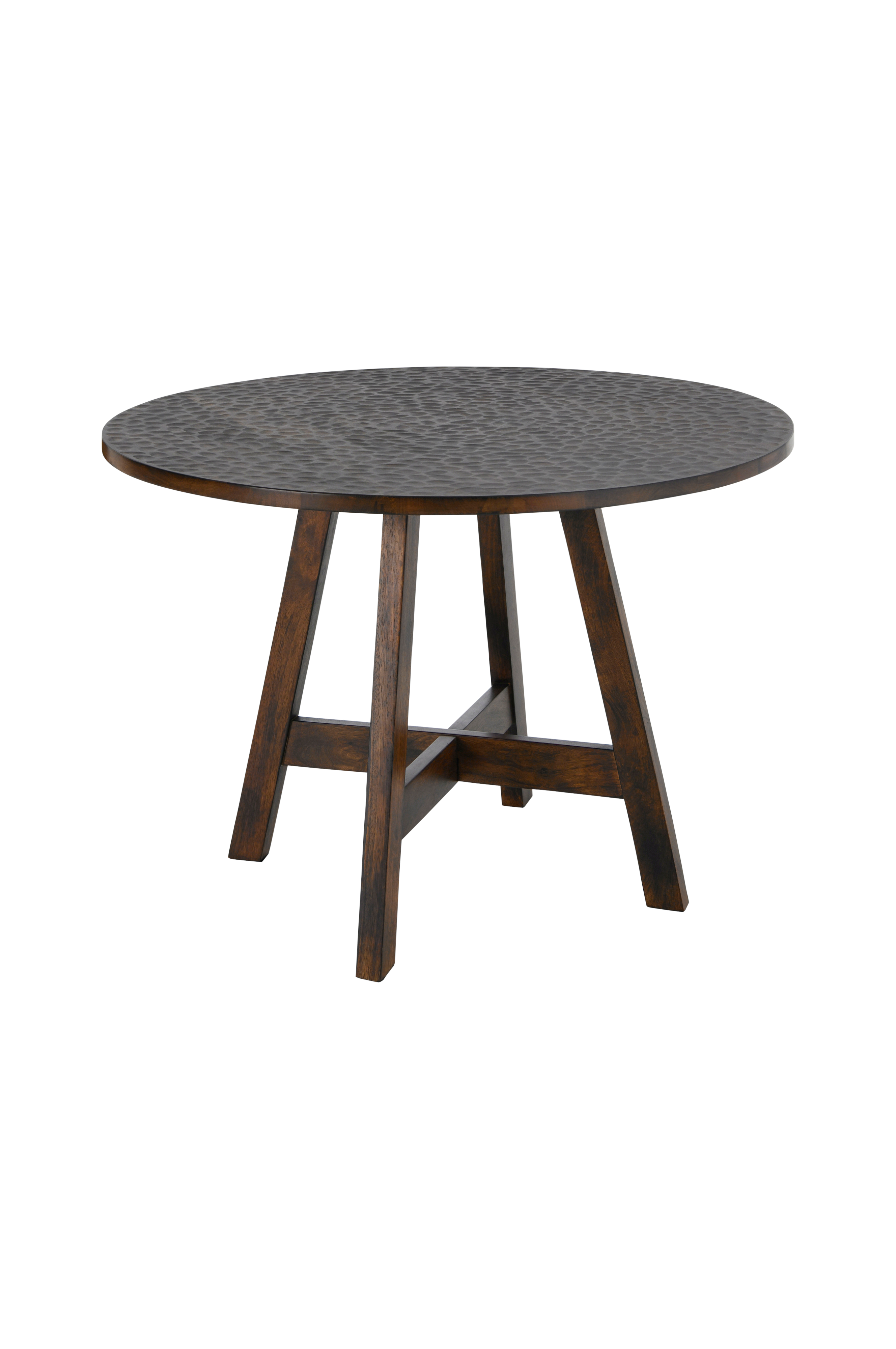 Pyöreä ruokapöytä vahapintaista mangopuuta ja koristeellinen kaiverrettu kuvio pöytälevyssä.