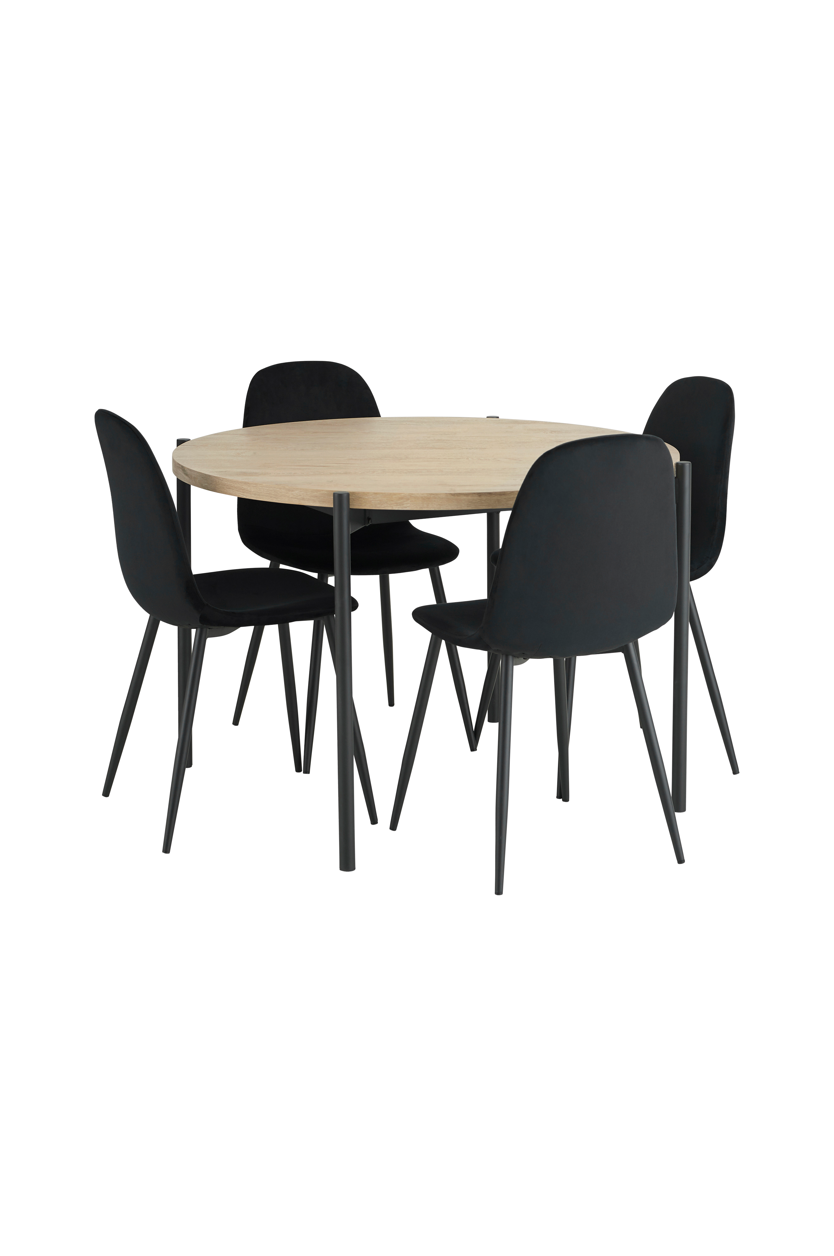 • Ruokailuryhmä, jossa on 1 pöytä ja 4 tuolia. Pöydässä on jauhemaalatut metallijalat ja pöytälevy folioitua MDF-levyä. Ruokailuryhmään kuuluu 4 tuolia, joissa on metallijalat ja istuin vaahtomuovitäytteellä ja samettiverhoilulla. Pöydän mitat: Korkeus 75 cm, halkaisija Ø 110 cm. Tuolien mitat: Korkeus 85 cm, leveys 44 cm, syvyys 54 cm.
