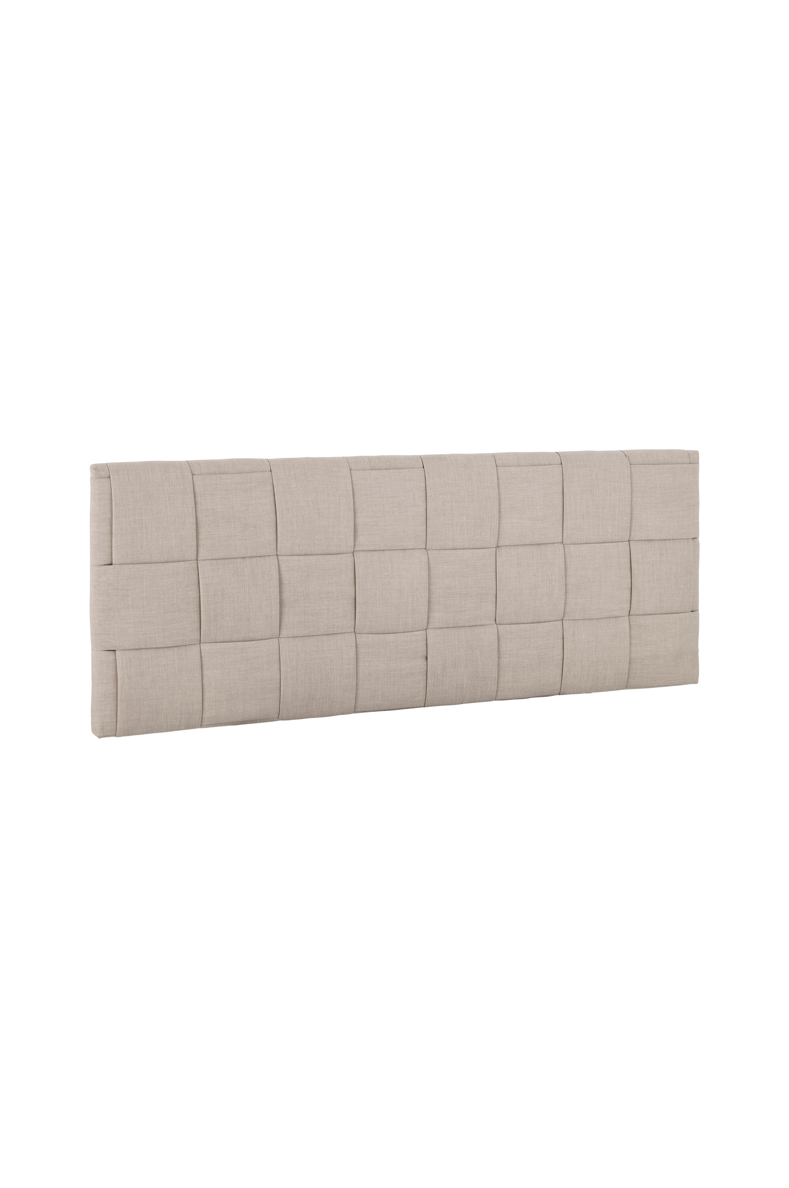 Topattu sängynpääty, jonka runko massiivipuuta ja vaneria. Päällinen pellavannäköistä polyesteriä. Punottu kuvio. Täyte polyesterivanua. Ripustetaan seinälle.