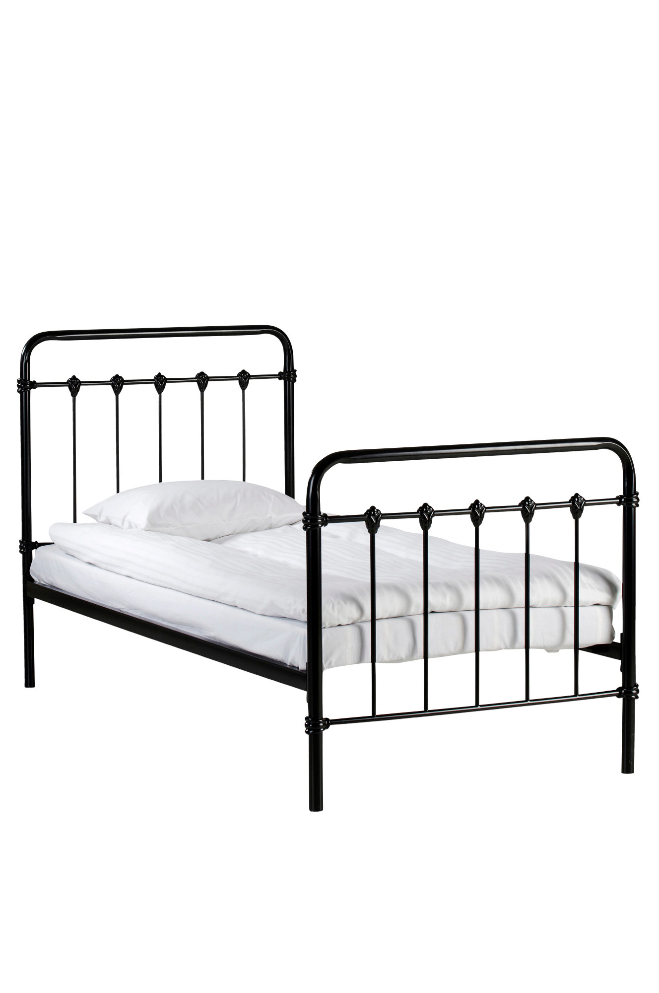 Teollista tyyliä. Metallia, sälepohja puuta. Vuodemitat 90x200 cm. Ulkomitat 98x208, sängynpäädyn korkeus 115, jalkopääty 91 cm. Lattian ja sängyn alareunan välinen etäisyys 29 cm. Tankojen välinen etäisyys 10 cm. Vaahtomuovi- tai joustinpatjalle. Enimmäiskuormitus 120 kg.