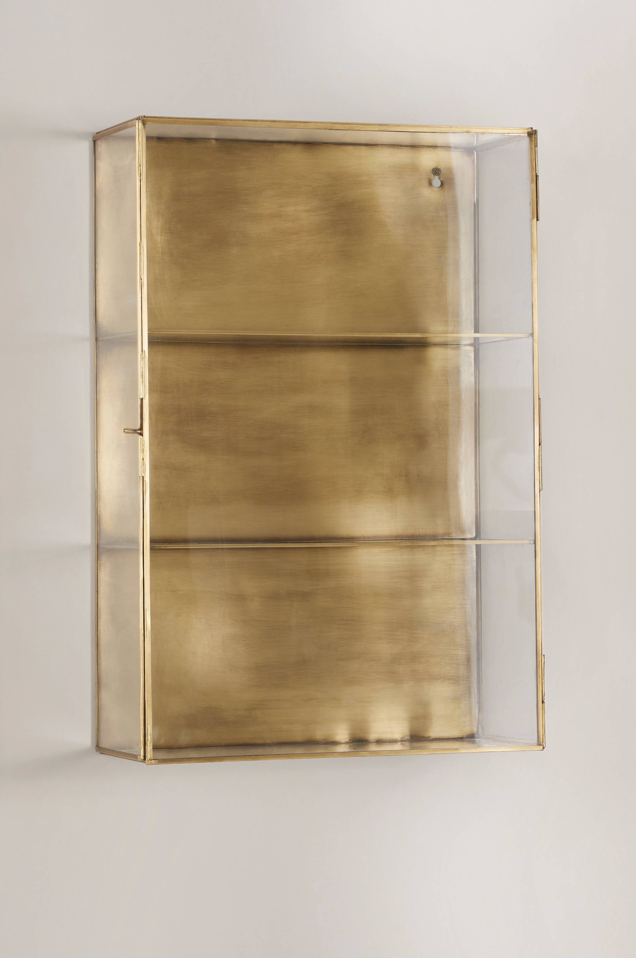 Kevyt ja kapea antiikkimessinginvärinen seinäkaappi ohutta metallia, jossa karkaistu lasi. Takaosa metallia. Lasiovi, jossa salpasuljenta. Kolme kiinteää lasihyllyä, joissa metallinen koristereuna. Mitat: Leveys 40,5 cm, korkeus 60 cm, syvyys 15,5 cm. Hyllytasojen välinen etäisyys 19 cm. Toimitetaan koottuna.