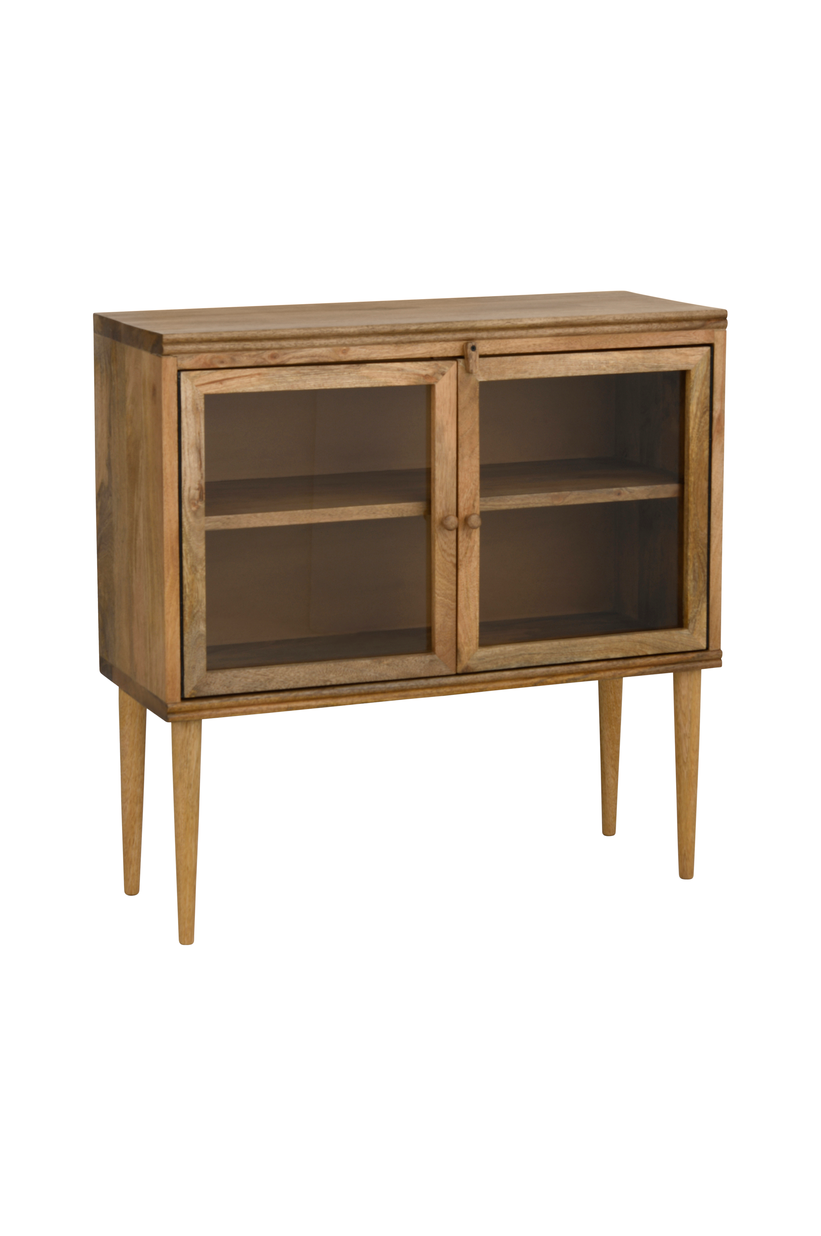 Helposti sijoitettava senkki mangopuuta. Kaksi vitriiniovea, joissa lasi, puuvedin ja koristeellinen käännettävä ovistopperi, joka pitää oven suljettuna. Kaapissa on yksi kiinteä hylly, jonka ala- ja yläpuolella on 20 cm tilaa. Kokonaismitat: Korkeus 80 cm, leveys 80 cm, syvyys 31 cm. Jalkojen korkeus 30 cm. Enimmäiskuormitus: 10 kg senkin päällyslevy ja 10 kg/hylly (yhteensä 30 kg). Toimitetaan osittain koottuna (jalat tulee ruuvata paikoilleen). Paino 16 kg.