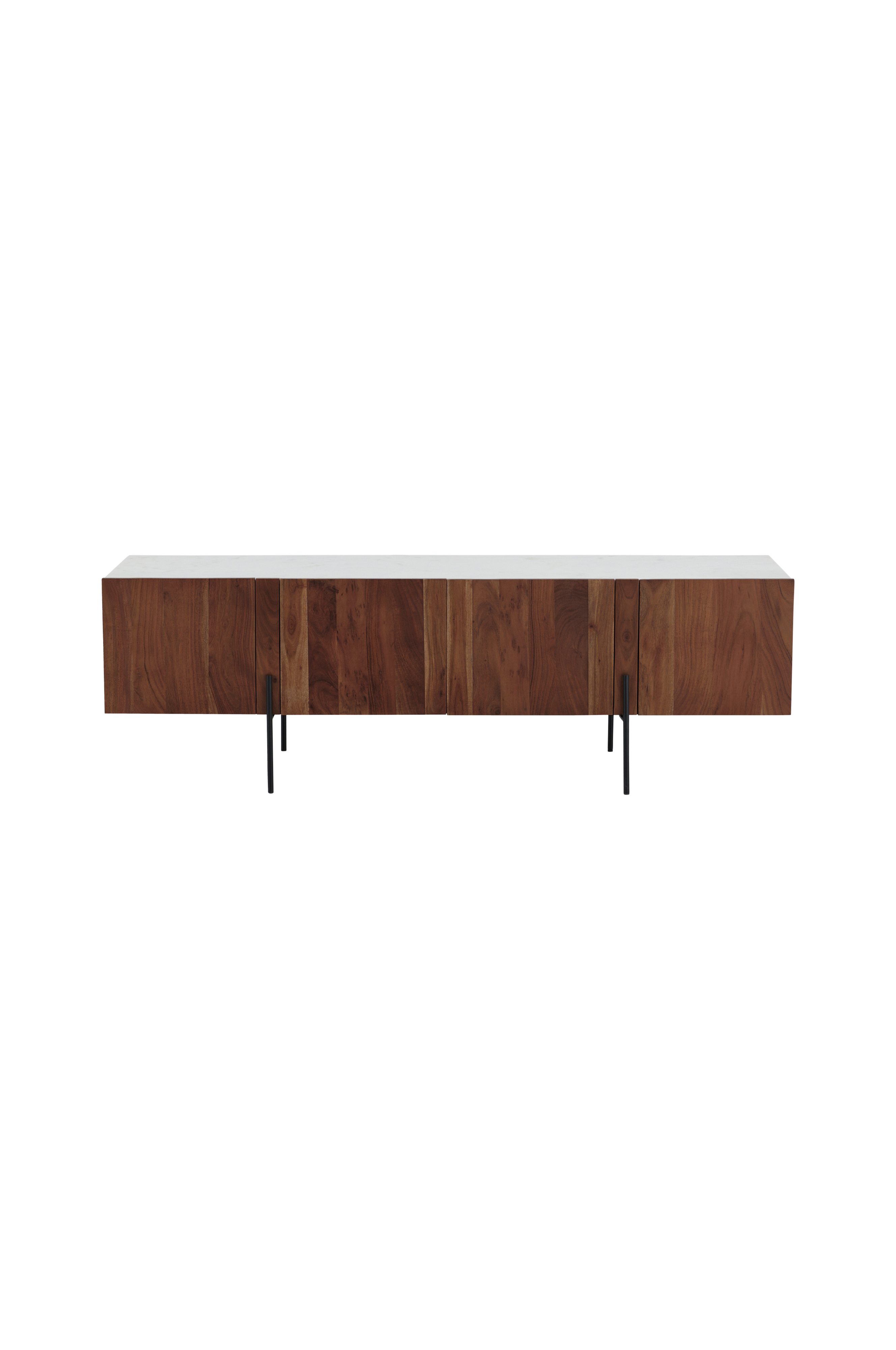 Senkki, jossa pöytälevy marmoria. Ovet ja sivut massiiviakasiaa. Tausta MDF-levyä. Neljä kaappia ilman hyllytasoa. Jalat jauhemaalattua mattapintaista metallia. Tila huonekalun alla 18 cm.