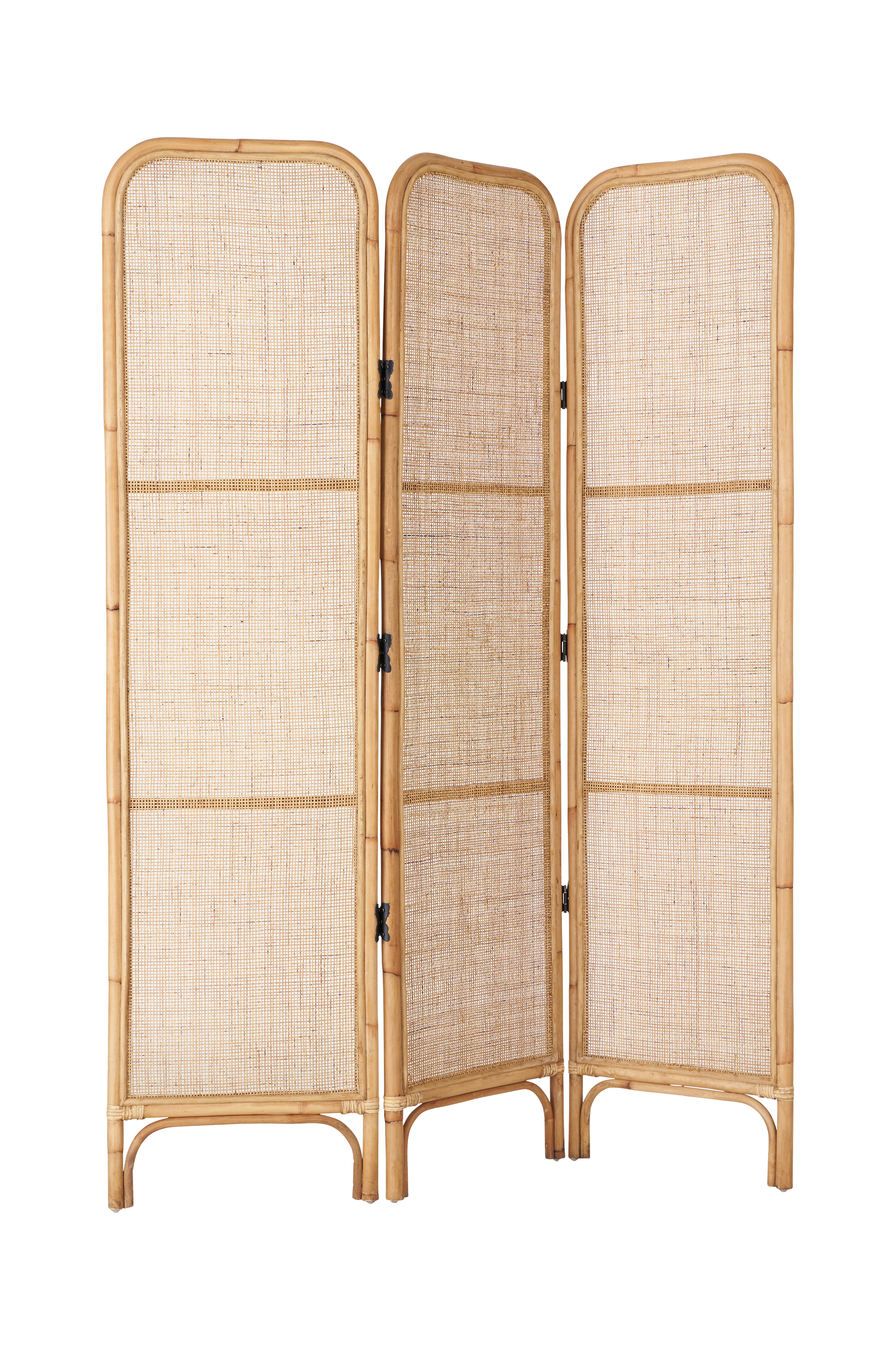 3-osainen sermi/tilanjakaja struktuuripintaista rottinkia. Perhosenmuotoiset saranat metallia. Kokonaismitat: Leveys 137 cm, korkeus 175 cm, syvyys 10 cm.