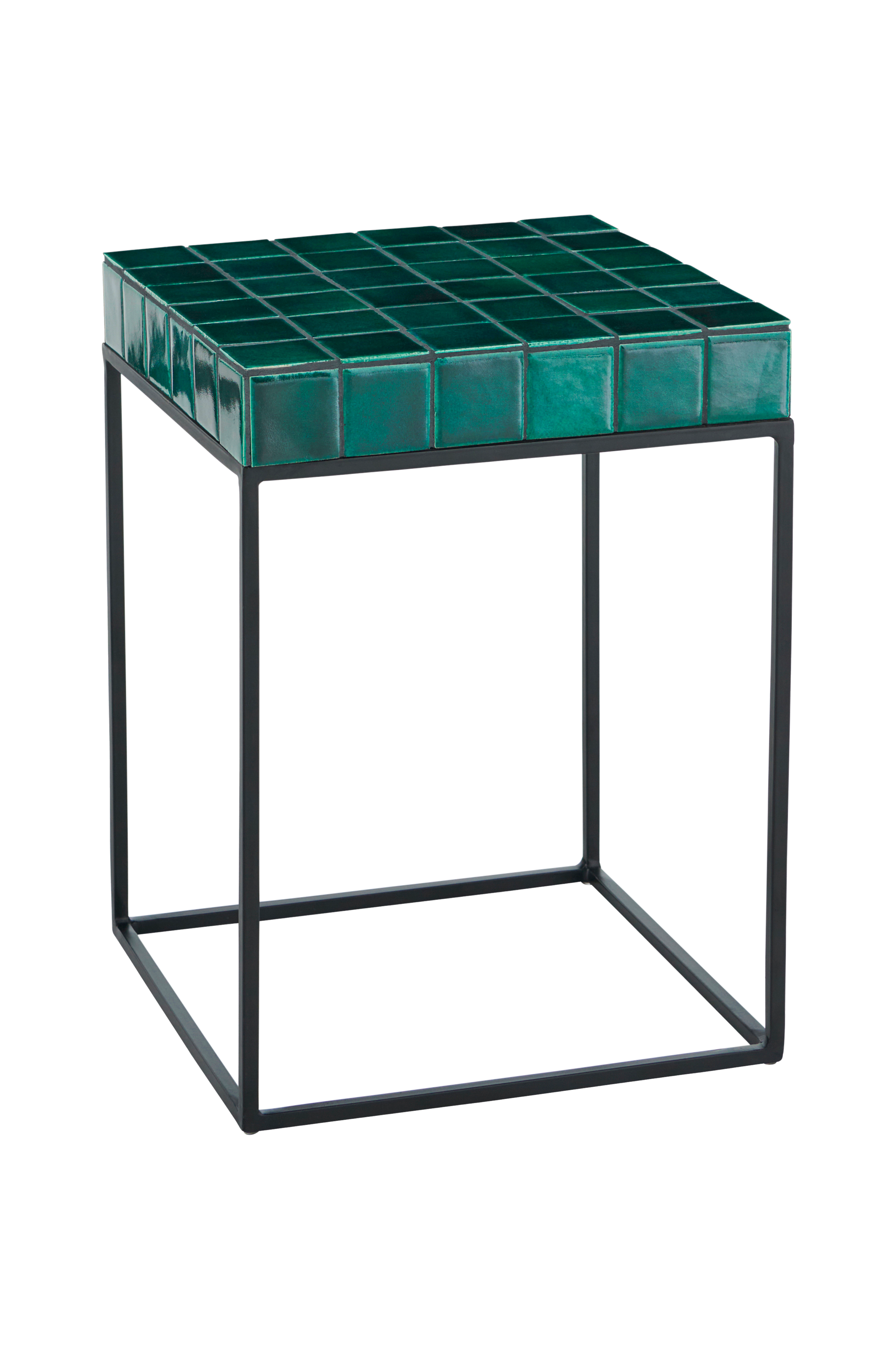 Sivupöydän runko jauhemaalattua metallia. Pöytälevy on valmistettu laatoista, jotka on asetettu ruutukuvion muotoon. MDF-levy alapuolella.