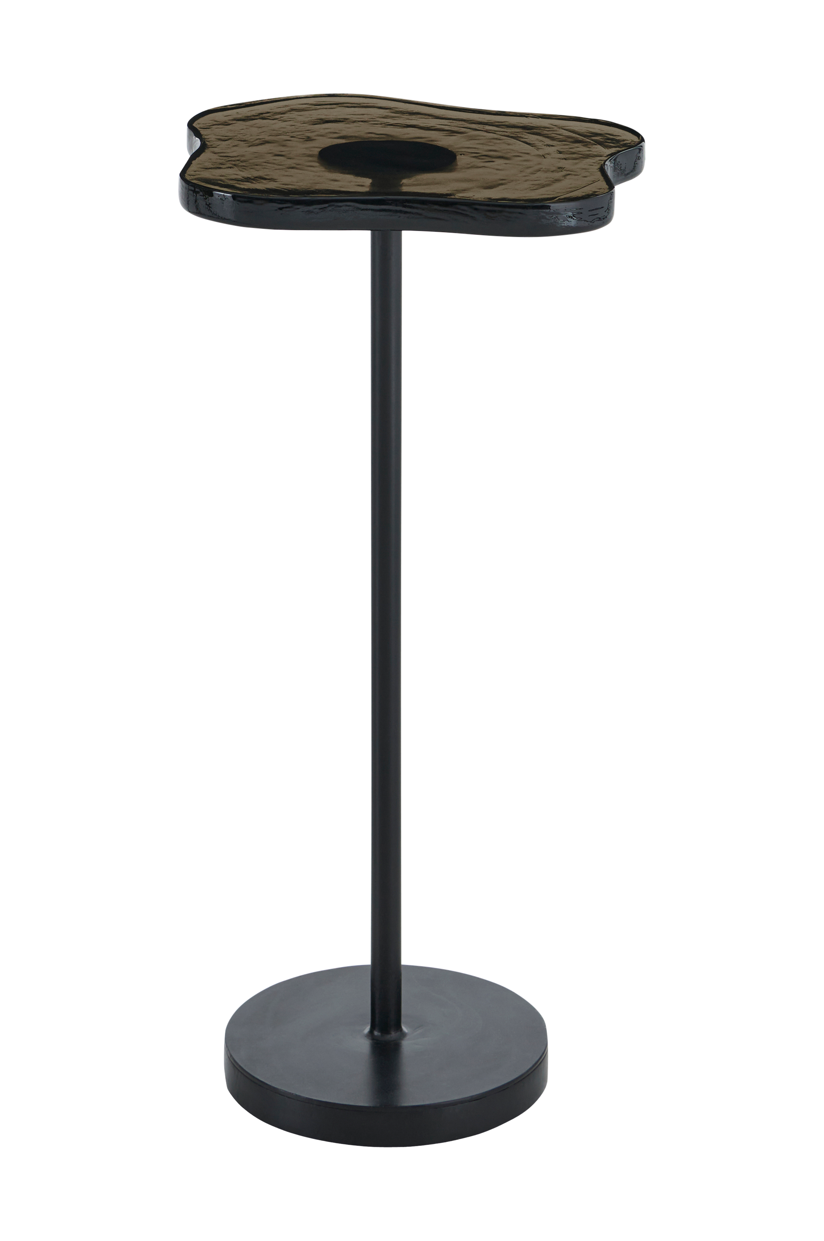 Orgaanisen muotoinen sivupöytä jauhemaalattua mattapintaista metallia. Pöytälevy paksua, värillistä karkaistua savulasia.