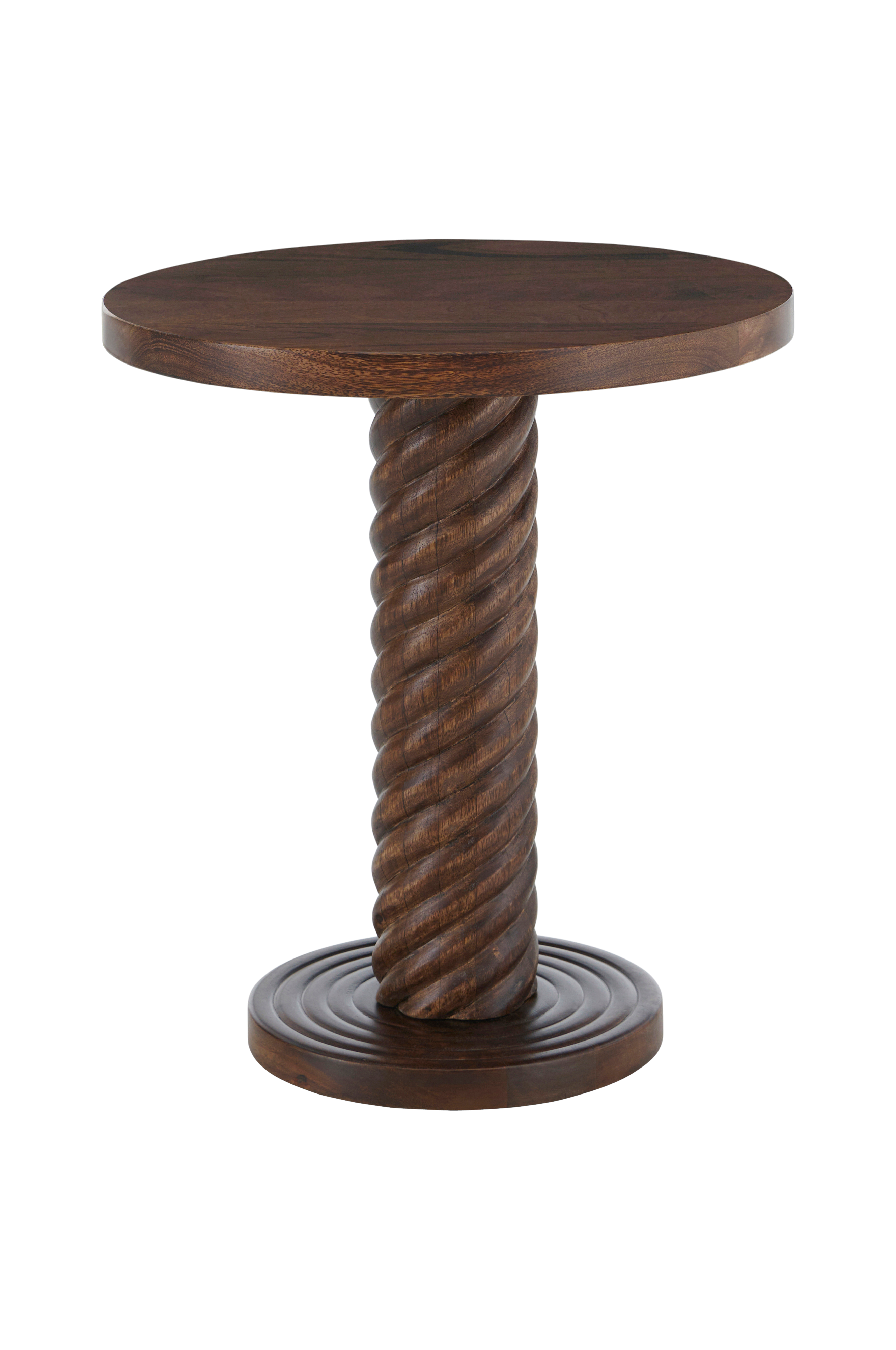 Pyöreä sivupöytä vahapintaista mangopuuta. Pyöreä, kierrekuvioinen sorvattu jalka.