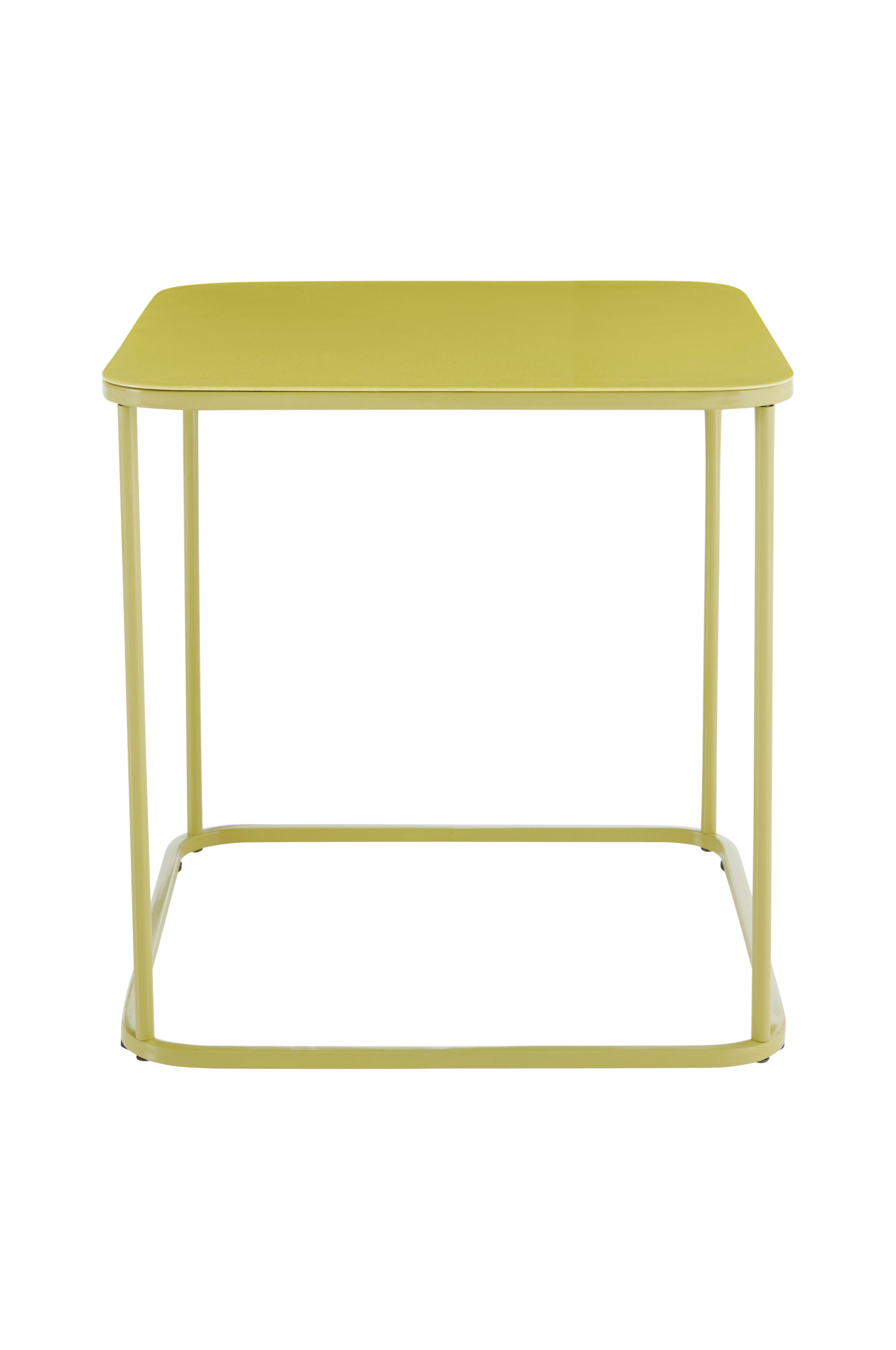 Metallinen sivupöytä/yöpöytä, jossa emaloitu, kiiltävä pöytälevy.