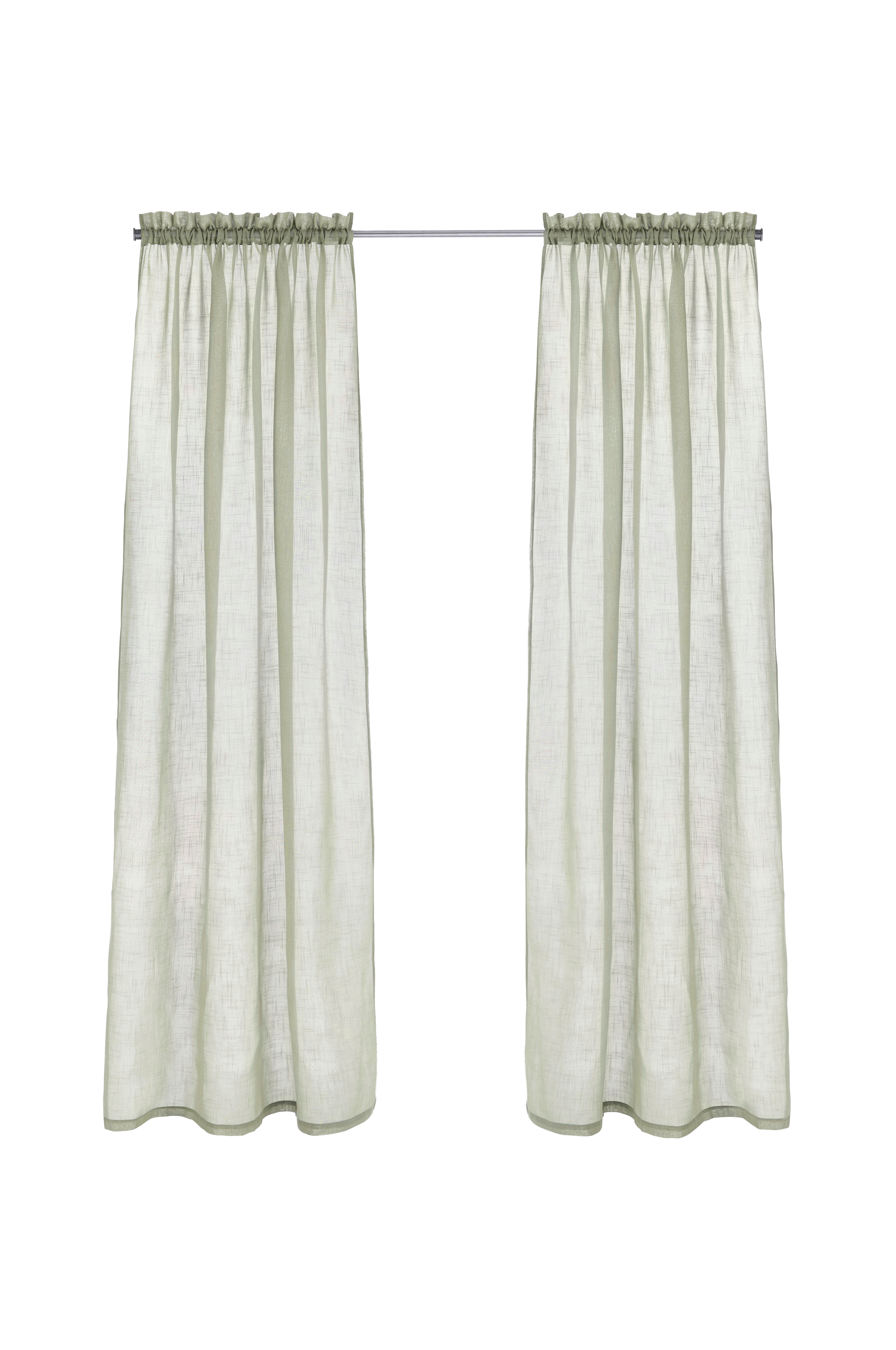 Kaksi sivuverhoa läpikuultavaa polyesteriä, jossa pellavamainen pinta. 5 cm:n harja. Leveys 134 cm. Kaksi pituutta: 220 ja 250 cm.