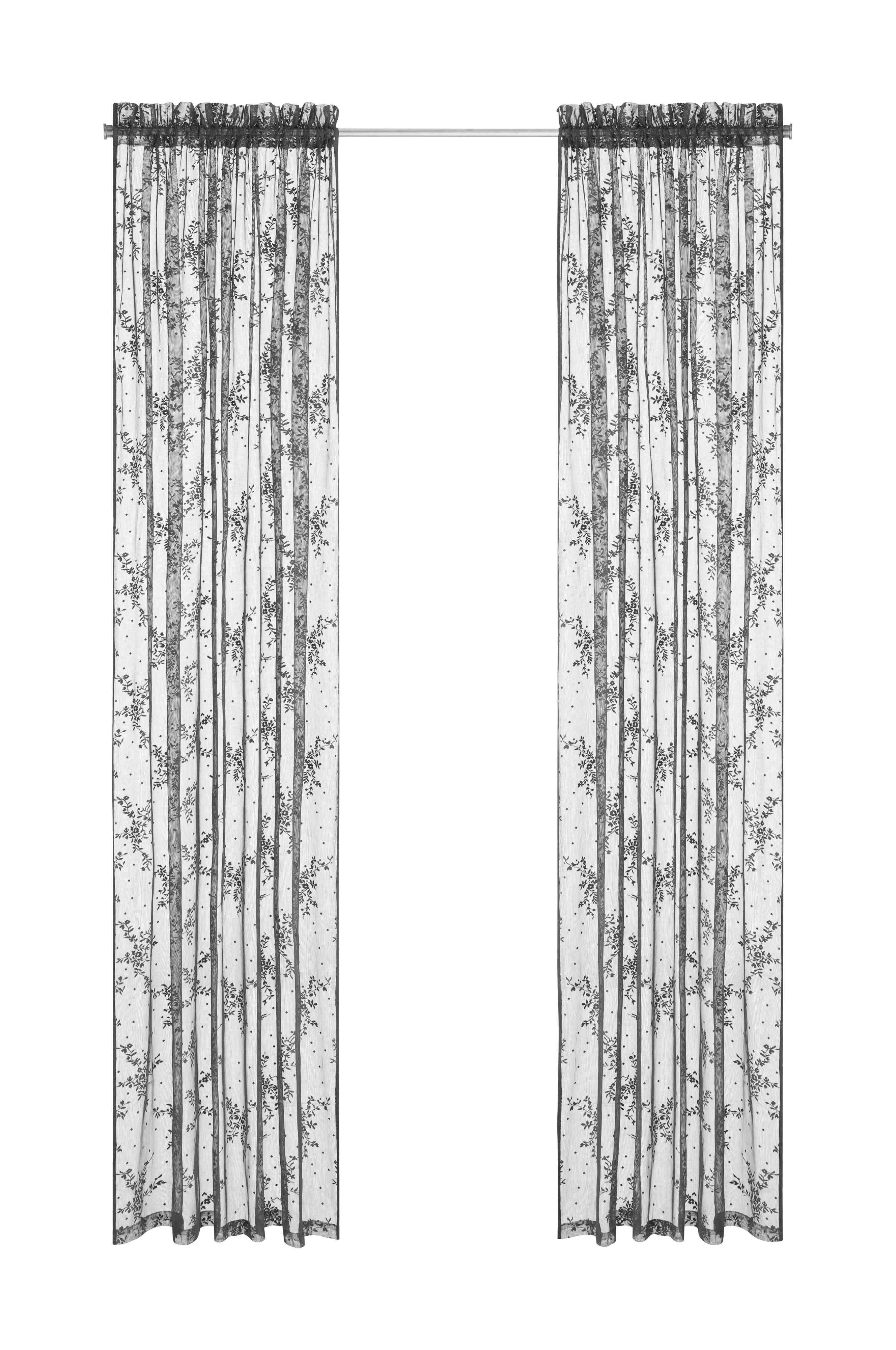 Kaksi sivuverhoa läpikuultavaa ja kevyttä polyesteripitsiä. Ommeltu kuja ylhäällä. Leveys 140 cm. 3 pituutta: 160, 220 ja 250 cm.