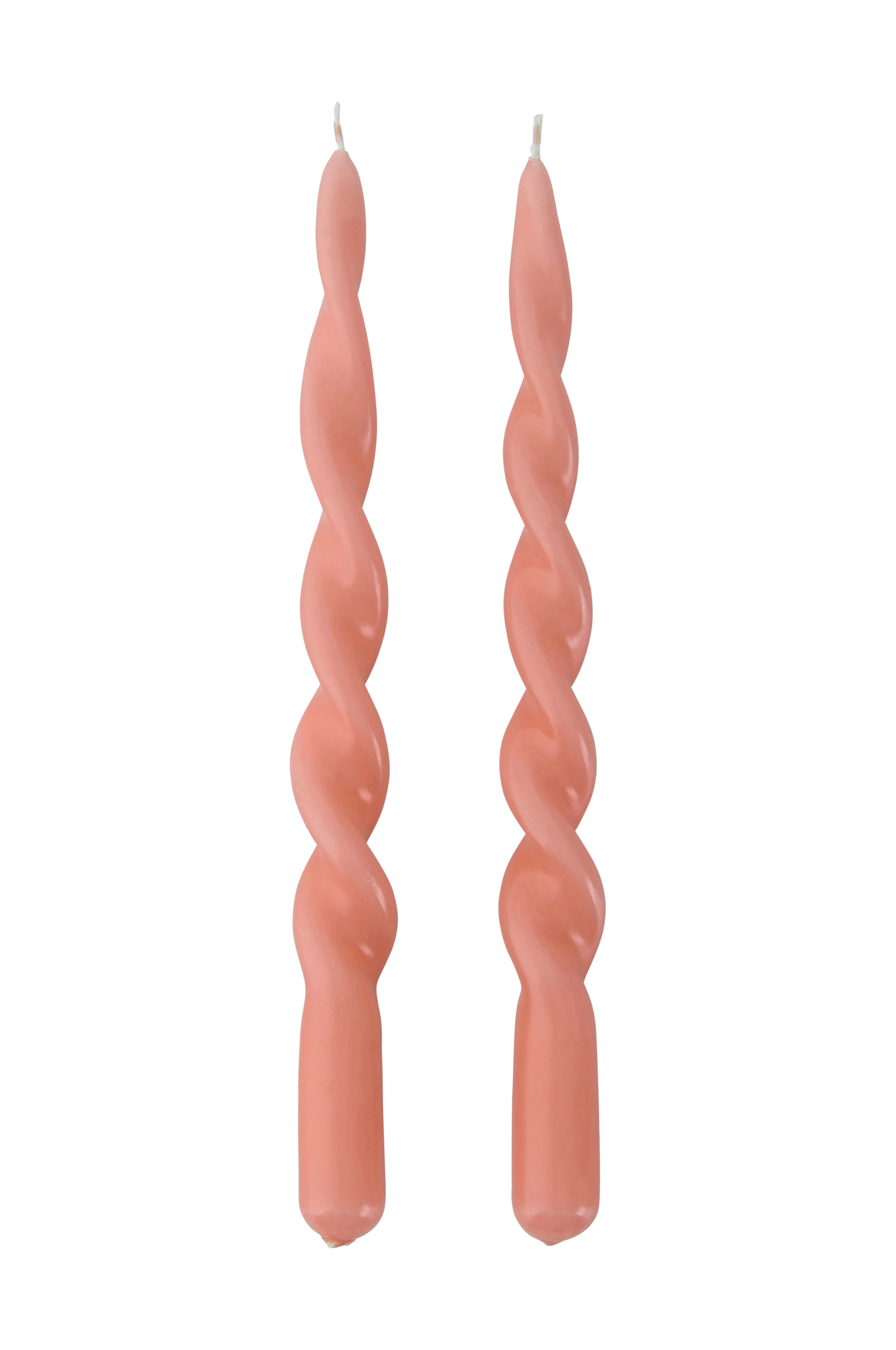 Kierretyt, litteät kynttilät, 2/pakkaus. Korkeus 29 cm, halkaisija 2,2 cm. Paloaika n. 9 tuntia. Kynttilät ovat 100% parafiinia. Parafiinia käytetään steariinin sijaan, koska se on pehmeämpi materiaali, jolloin kynttilän voi muotoilla ja kiertää. Tämä ei onnistu steariinilla, joka on liian kovaa kierrettäväksi.