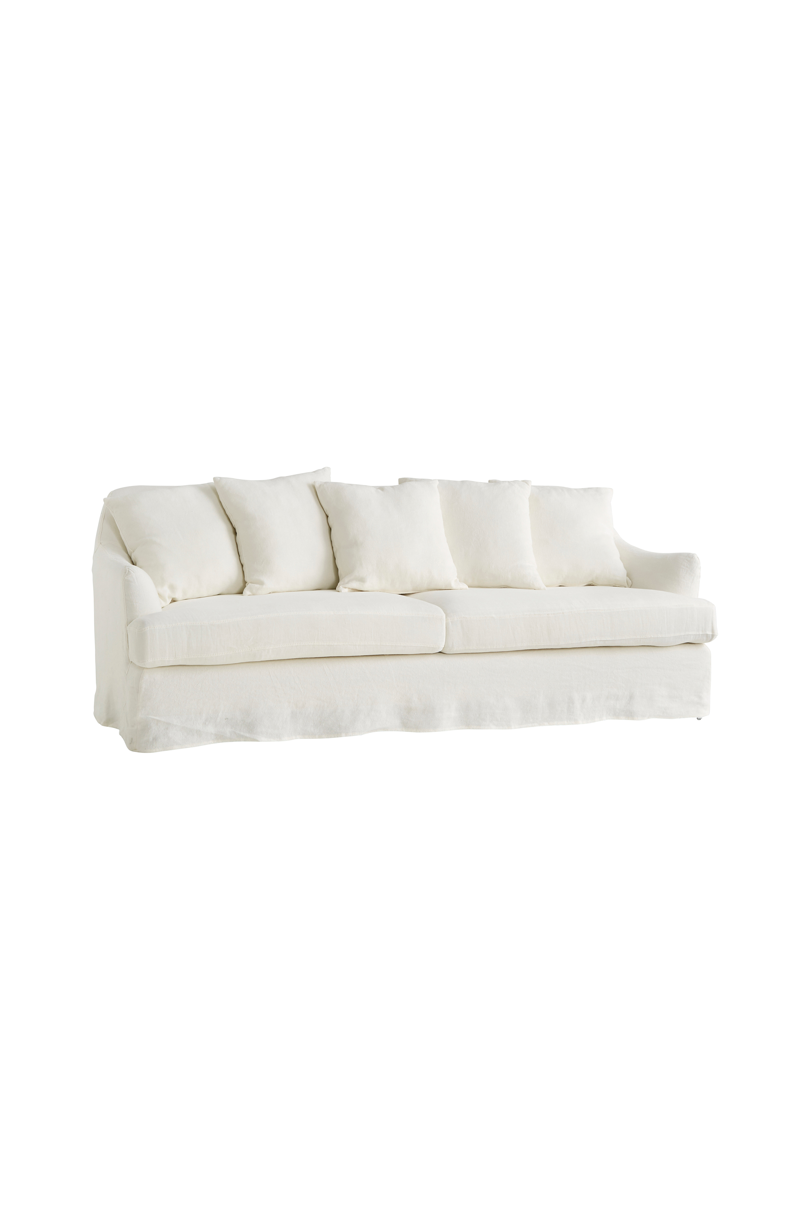 Romanttinen sohva, jossa pyöristetyt muodot ja 5 selkätyynyä. Päällinen 100% pellavaa. Päällinen on irrotettava ja kestää vesipesun 40 asteessa. Runko vaneria ja massiivimäntyä. Istuinpehmusteiden ja tyynyjen täyte polyuretaanivaahtoa ja kuitua. Metallijalat. Mitat: Leveys 210 cm, korkeus 77 cm, syvyys 86 cm. Istuinkorkeus 43 cm, istuinleveys 177 cm, istuinsyvyys 60 cm. Jalkojen korkeus 11 cm.