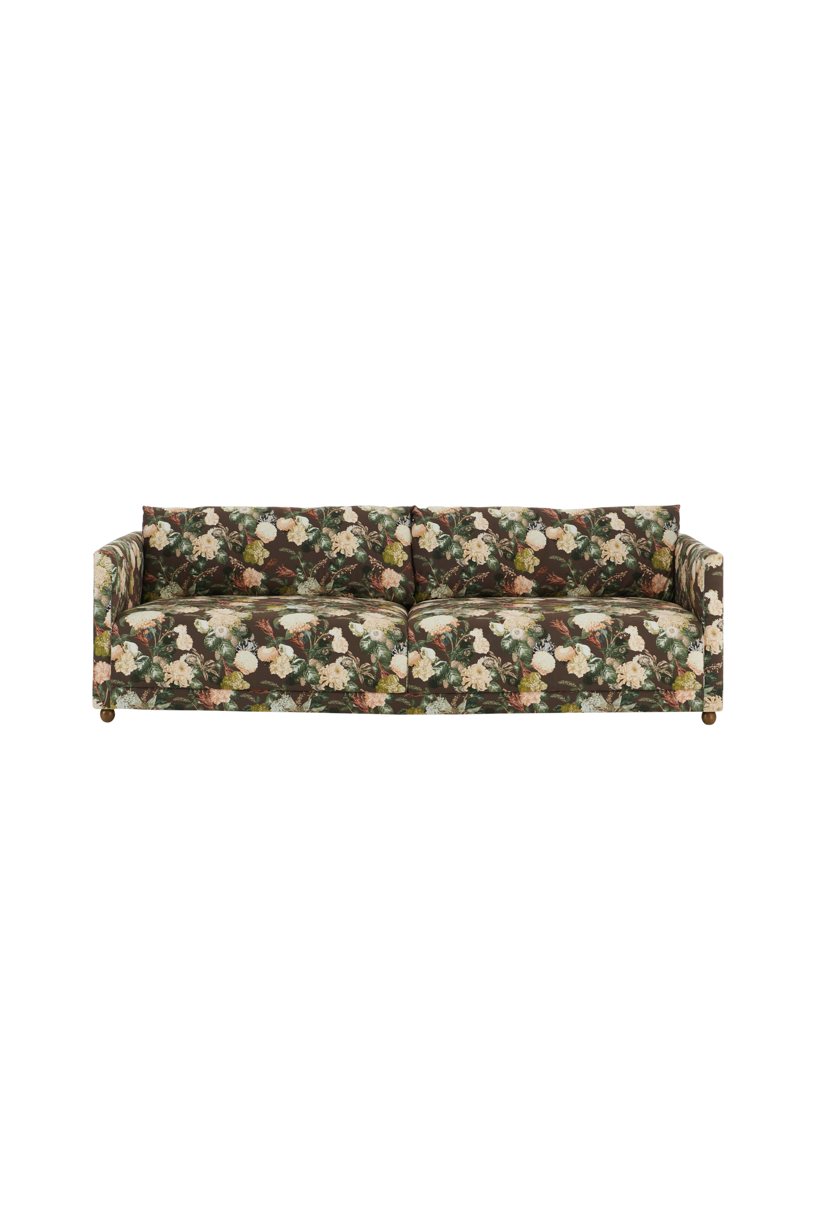 3:n istuttava sohva, jossa kukkakuvioinen päällinen. 2 selkätyynyä.