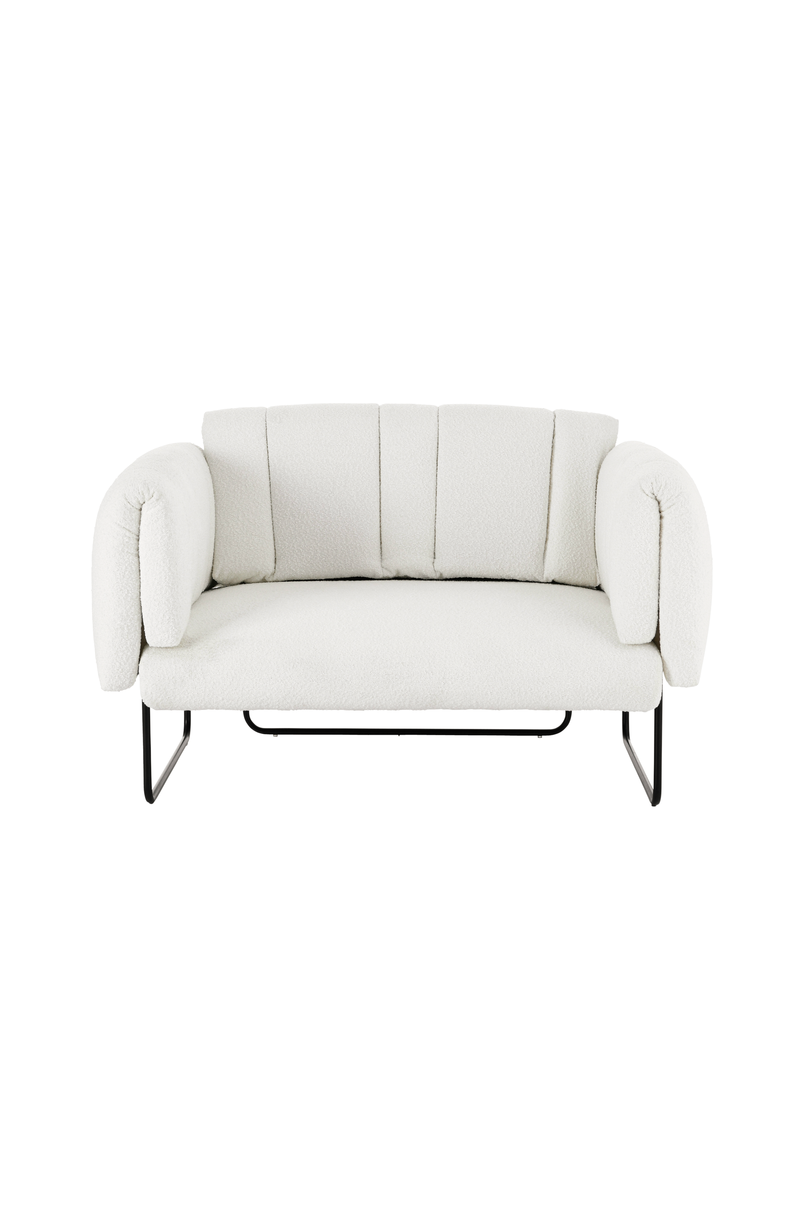Pieni, kompakti ja helposti sijoitettava sohva, jonka päällinen polyesteribukleeta. Moderni muotoilu ja taivutetut, pehmustetut käsinojat. Jalat jauhemaalattua metallia. Vaahtomuovitäyte. Enimmäiskuormitus 280 kg. Tila huonekalun alla 26 cm.
