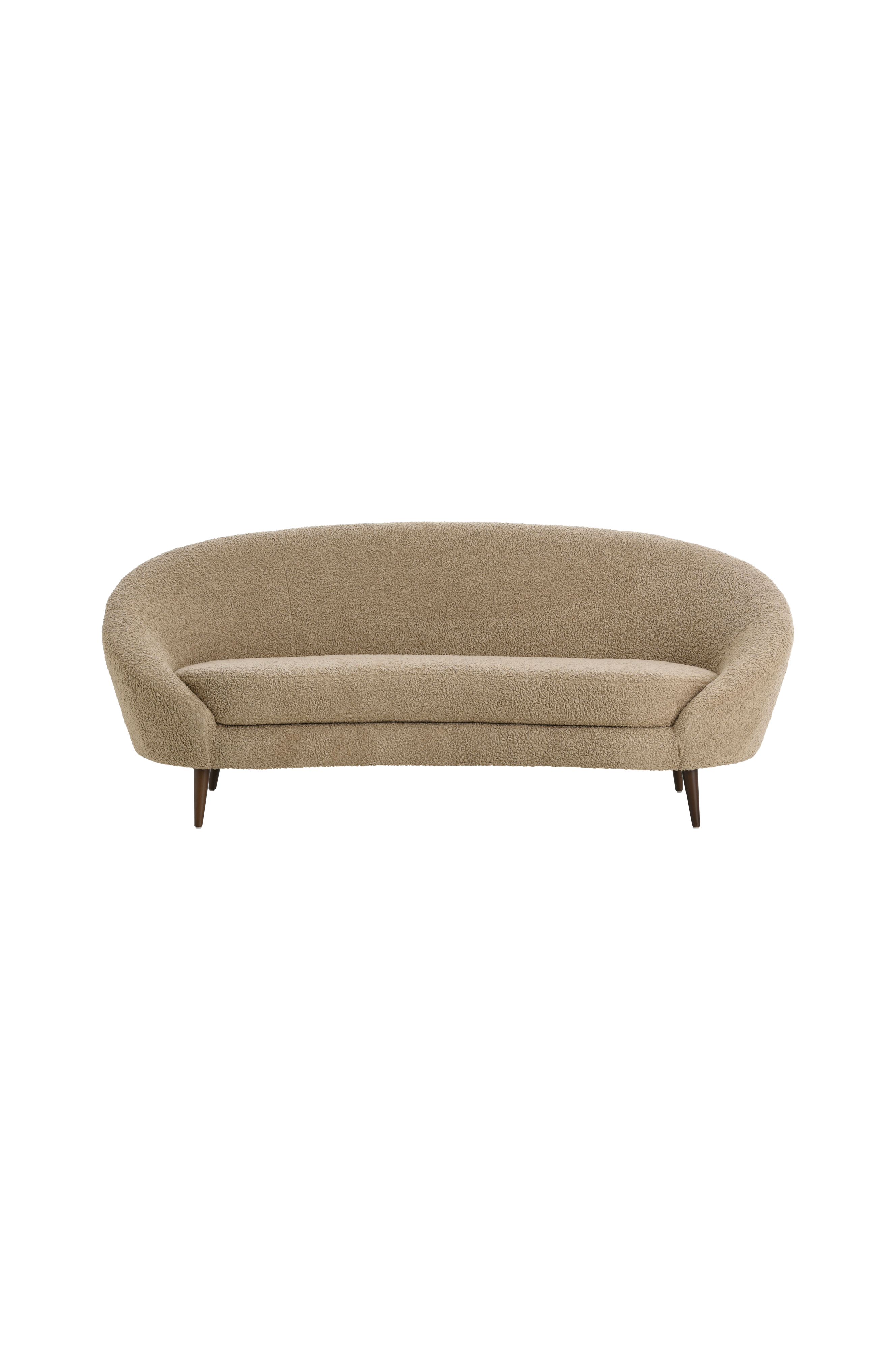 3:n istuttava sohva, jossa moderni, orgaaninen muoto. Runko massiivimäntyä ja vaneria. Jalat pyökkiä. Päällinen pehmeää polyesteristä valmistettua lampaankarvajäljitelmää. Päällistä ei voi irrottaa. Vaahtotäyte ja nozag-jouset. Tila huonekalun alla 17 cm. Toimitetaan koottuna.