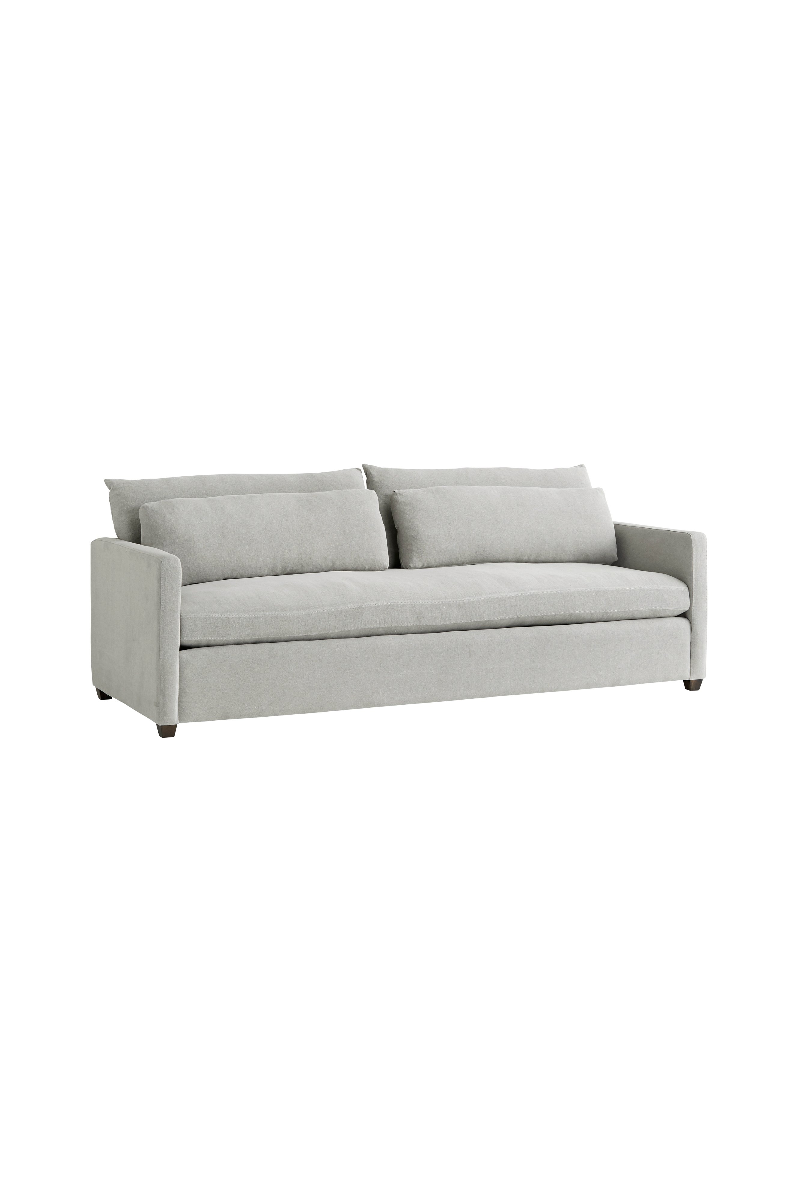 Skandinaavistyylinen sohva, jossa pellavapäällinen. Kiinteät istuintyynyt ja kaksi irrallista selkätyynyä. Päällistä ei voi irrottaa. Kokonaismitat: Korkeus 88 cm, leveys 244 cm, syvyys 98 cm. Istuinkorkeus 46 cm, istuinsyvyys 56 cm, istuinleveys 222 cm. Jalkojen korkeus 7 cm. Etäisyys lattiasta käsinojaan 68 cm. Toimitetaan koottuna, vain jalat on ruuvattava paikoilleen.