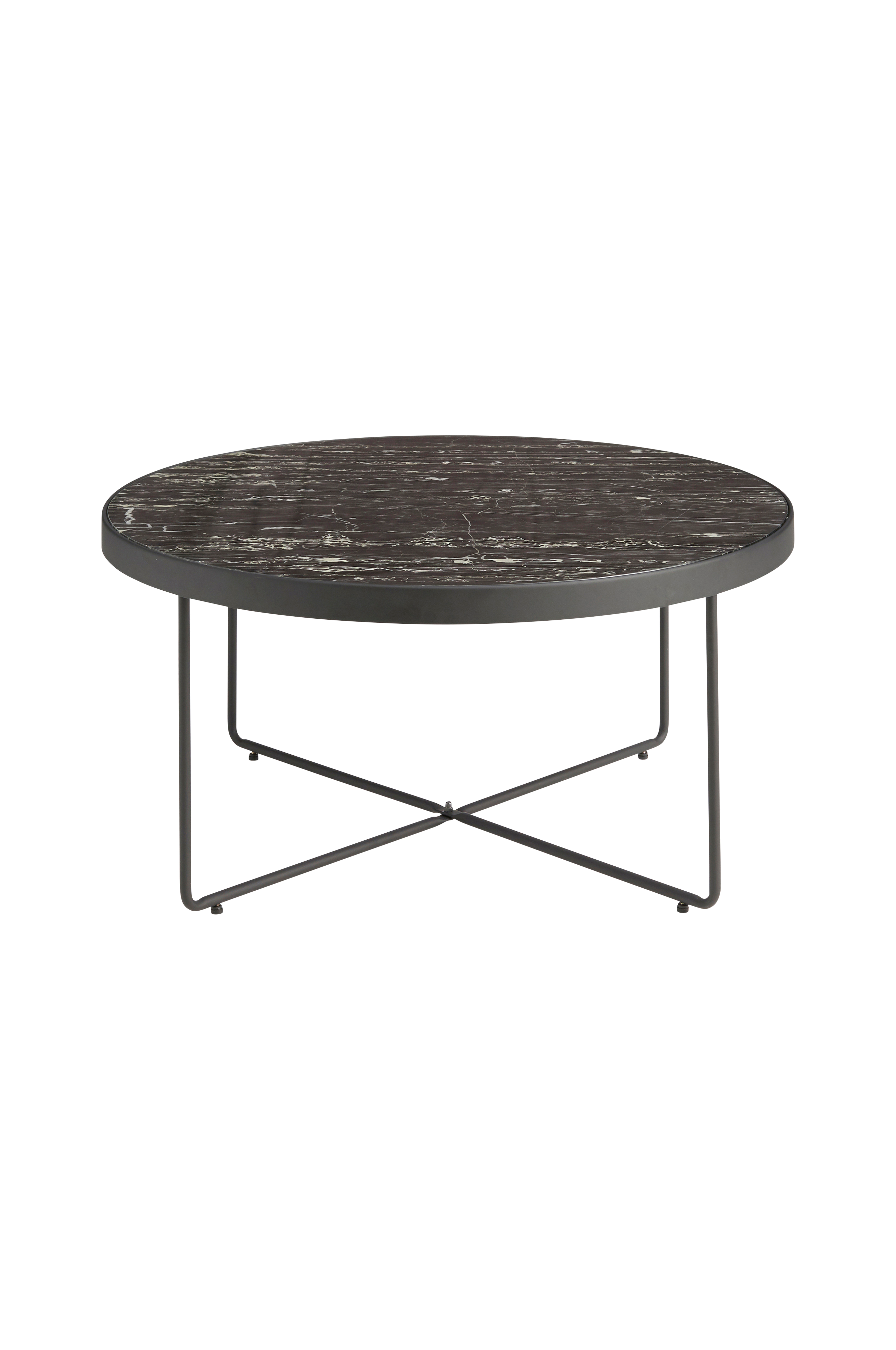 Pyöreä sohvapöytä, alusta ja jalat metallia. Pöytälevy karkaistua lasia, pohjassa marmoripainatus. Korkeus 39 cm, Ø 80 cm. Helppo koota.