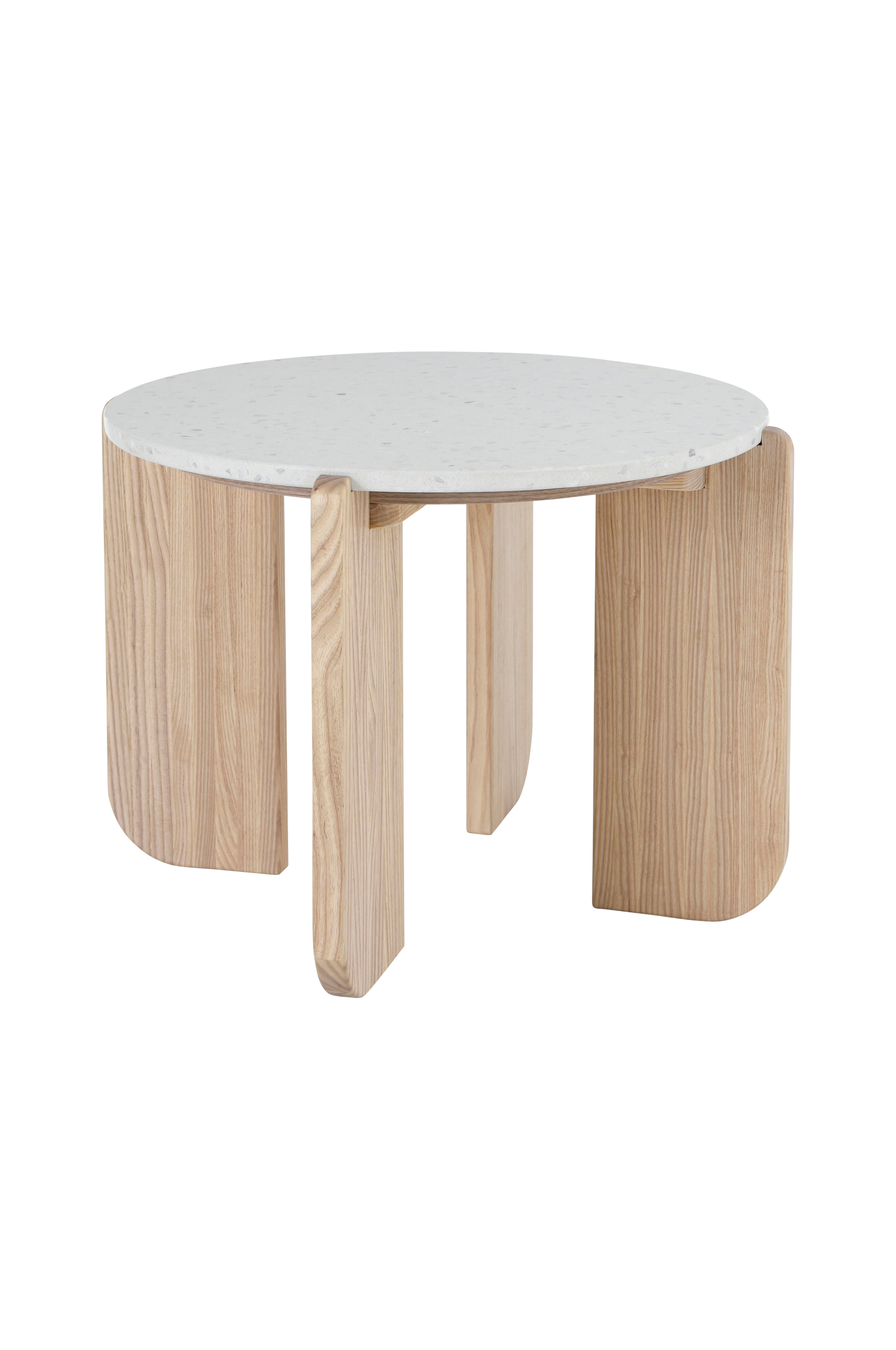 Sohvapöytä, jossa jalat vaaleaksi laseerattua massiivisaarnea. Pöytälevy Terrazzoa, jossa kiillotettu pinta. Pöytälevyn paksuus 18 mm.