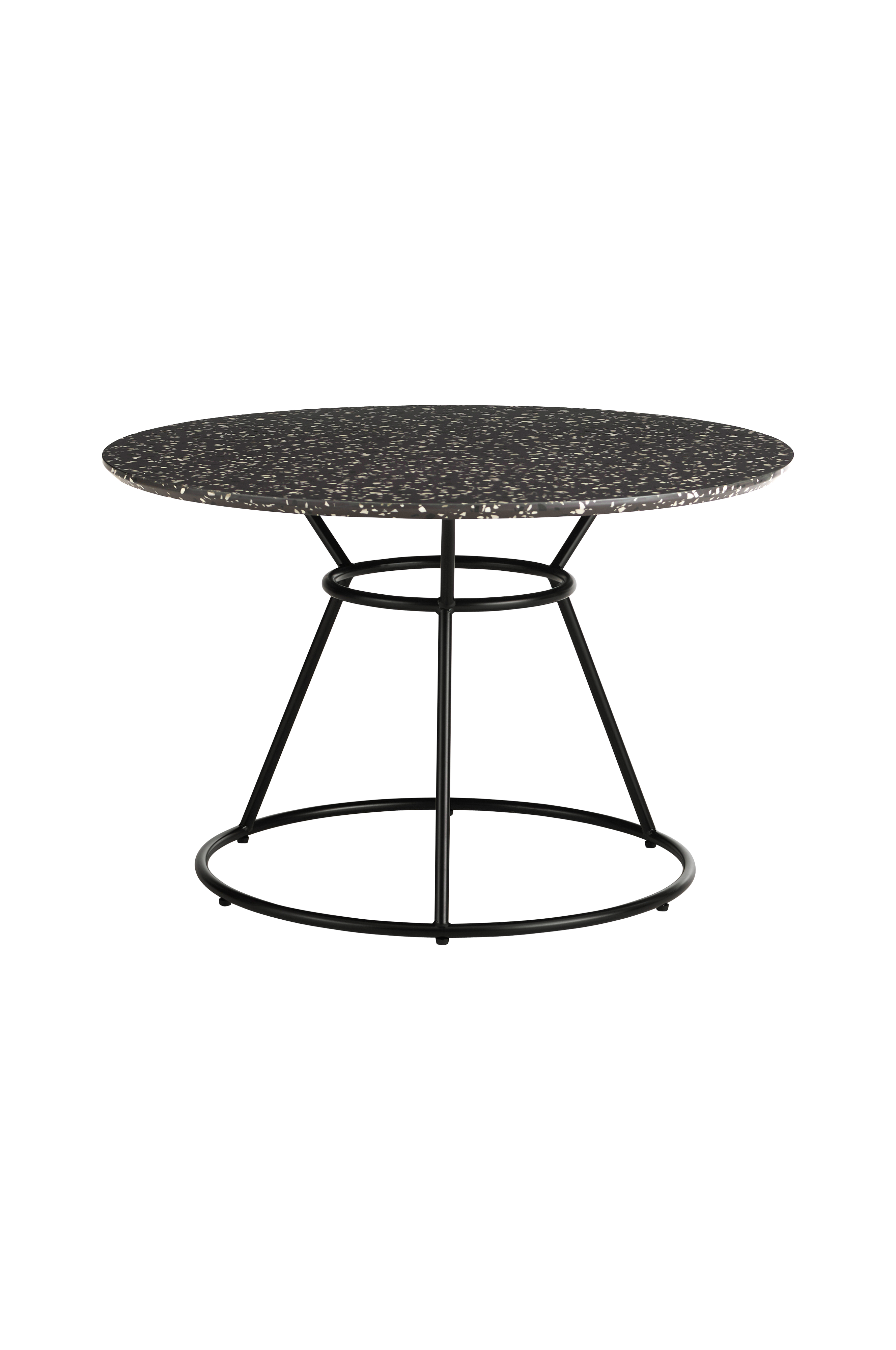 Sohvapöytä, jossa Terrazzo-kalvolla päällystetty pöytälevy MDF-levyä. Jalusta metallia. Pöytälevyn halkaisija 80 cm. Halkaisija alhaalla 60 cm. Helppo koota.
