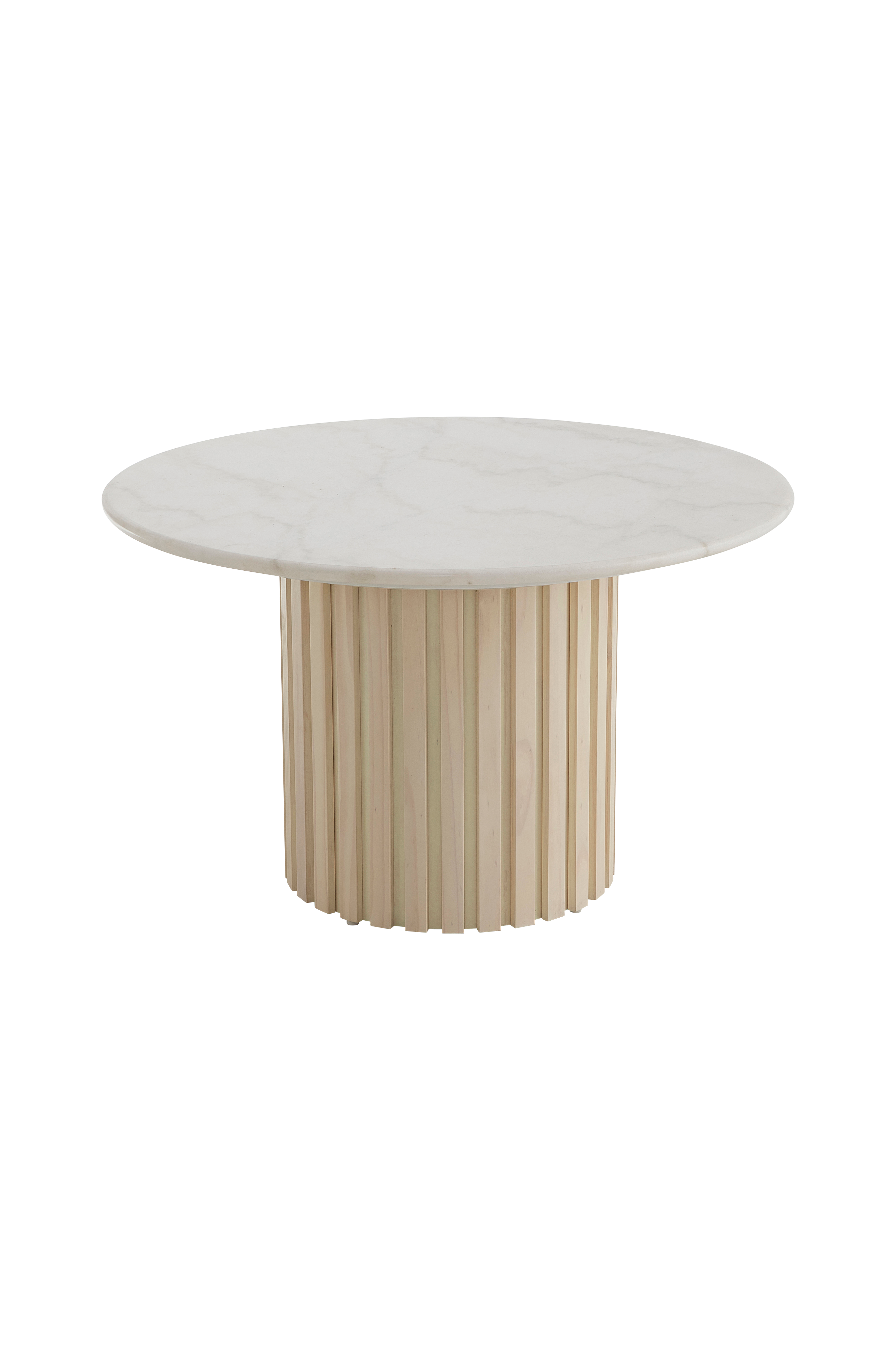 Sohvapöytä, jossa pöytälevy marmoria ja alaosa mäntyä ja maalattua MDF-levyä. Toimitetaan kahdessa osassa. Helppo koota. Korkeus 48 cm. Ø 80 cm.