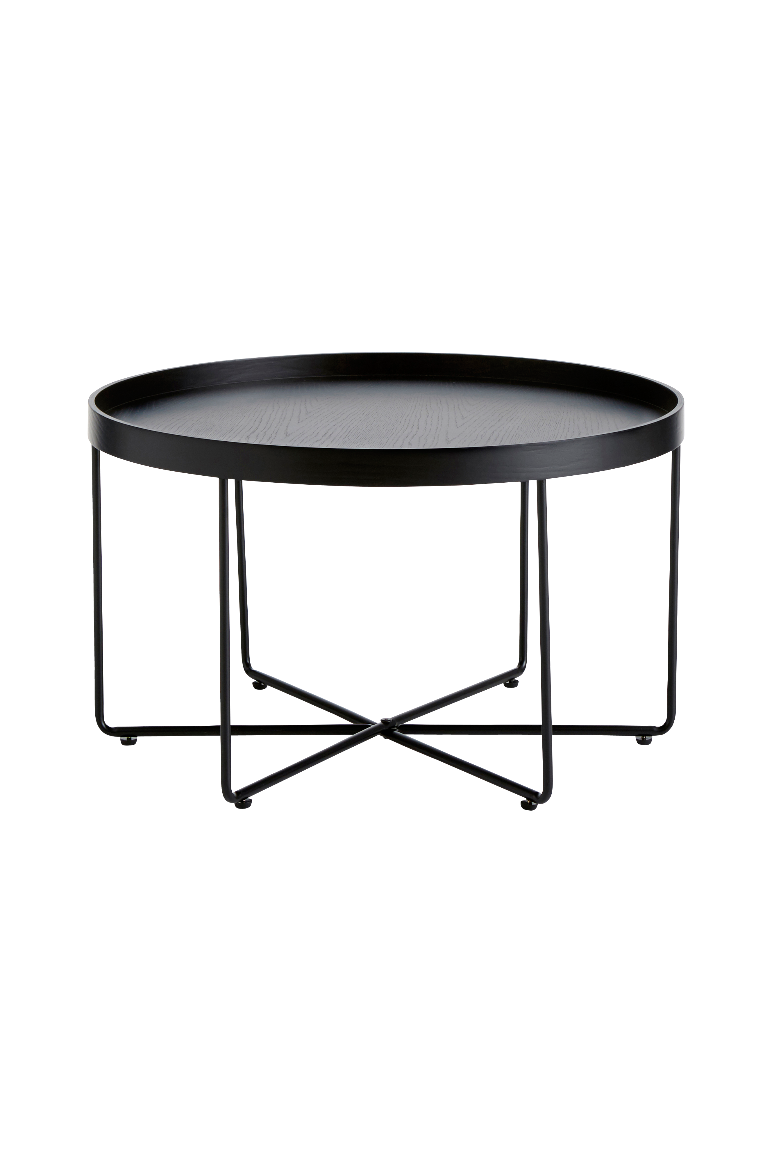 Pyöreä Telvin-sohvapöytä, jossa metallijalat ja pöytälevy MDF-levyä ja tammiviilua, jossa tyylikäs pintakuvio. Pöytälevy, jossa reuna.