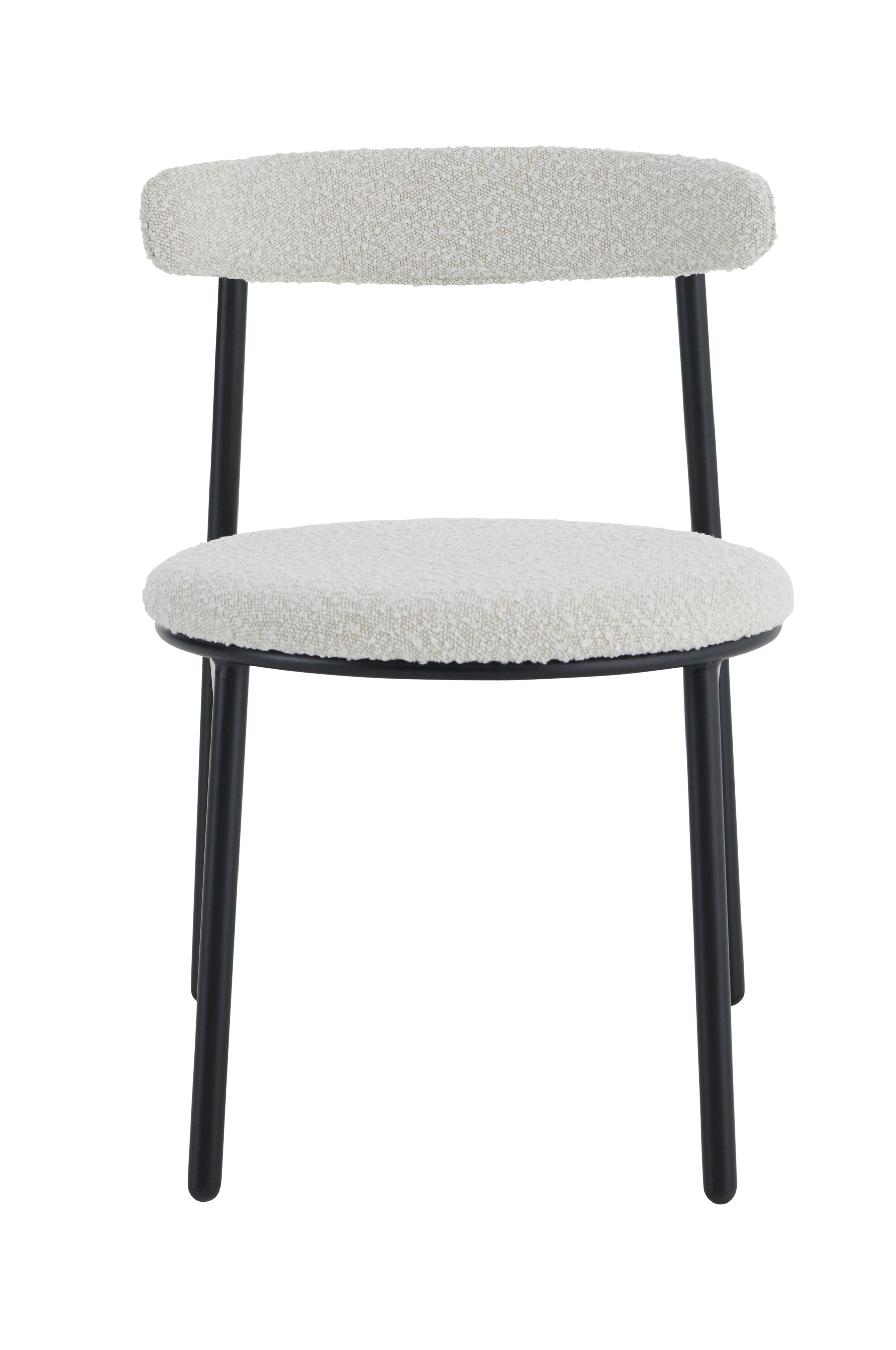 2 modernia tuolia, joissa pyöreä istuin ja kaareva selkänoja. Päällinen bukleekangasta. Runko ja jalat jauhemaalattua metallia. Istuimessa ja selkänojassa vaahtomuovitäyte. Enimmäiskuormitus 120 kg.