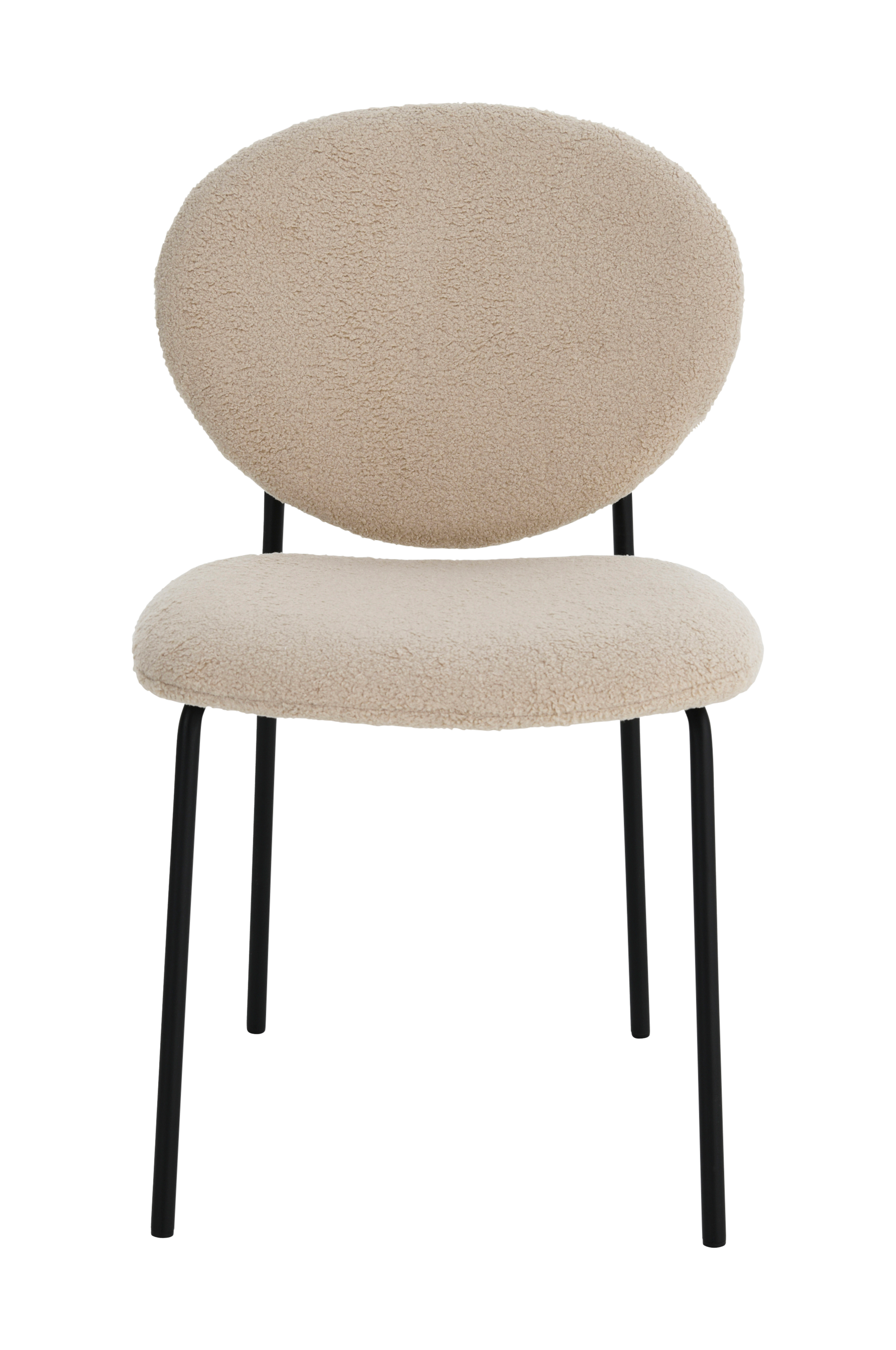 Kaksi tuolia, joissa moderni muotoilu ja jalat ja runko jauhemaalattua metallia. Pehmustettu istuinosa ja selkänoja, joissa teddyverhoilu. Vaahtomuovitäyte. Helposti koottava.