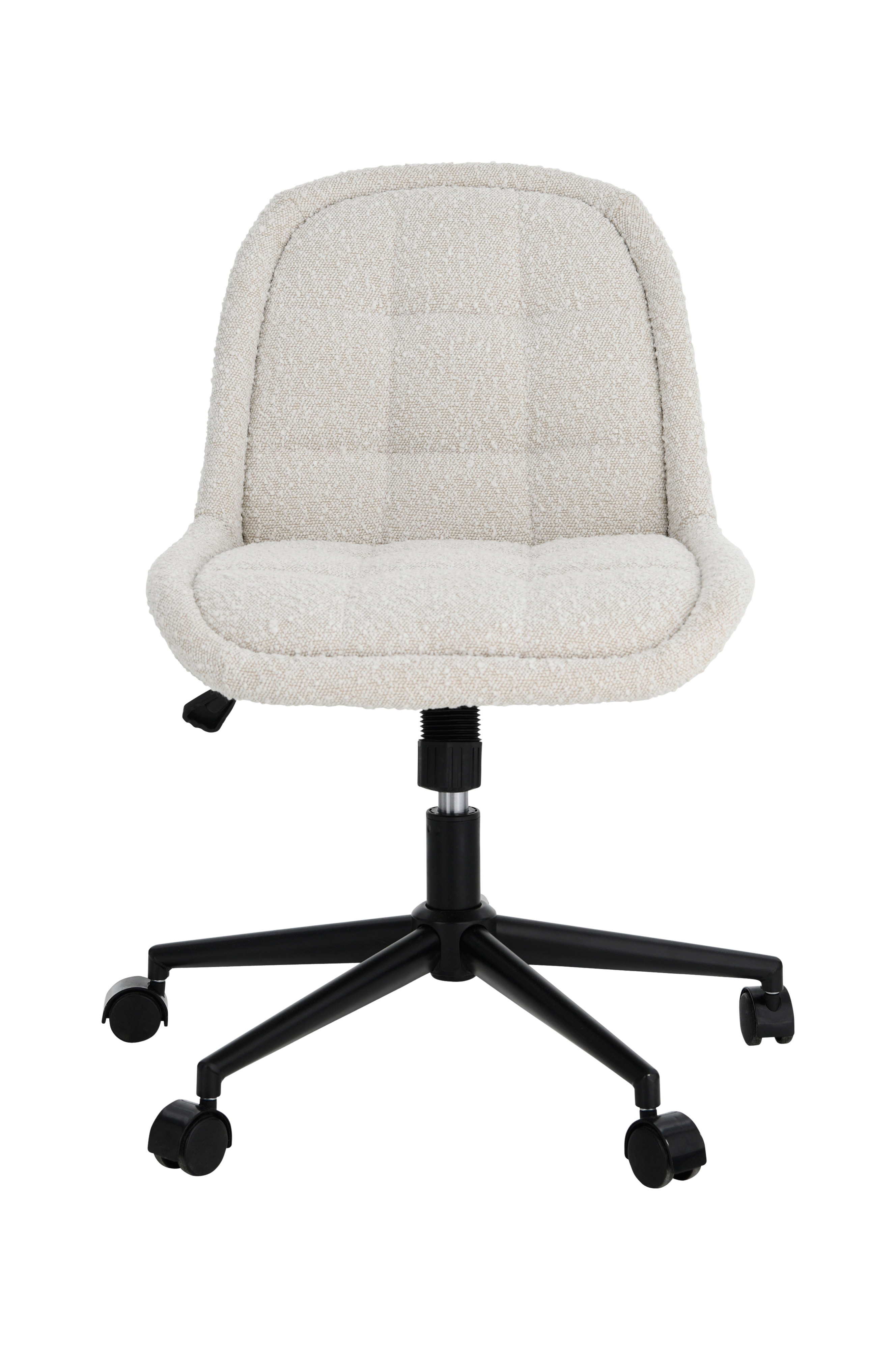 Kirjoituspöydän tuoli/työtuoli, jossa pehmustettu istuin ja bukleeverhoilu. Pyörälliset jalat jauhemaalattua metallia. Kallistustoiminto ja pyörivä istuin.