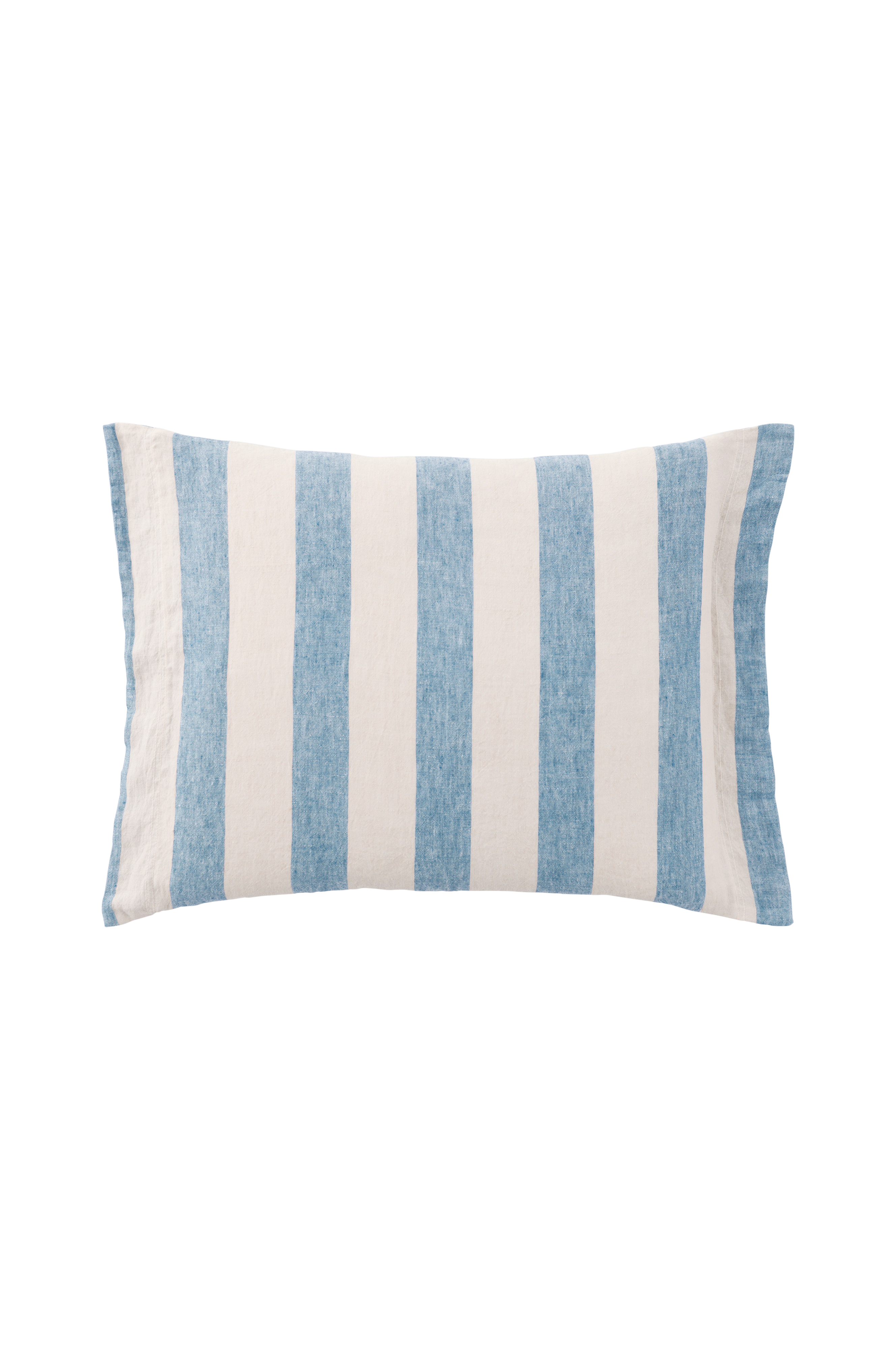 Tyynyliina pestyä ranskalaista pellavaa. Lankavärjätyt raidat. Koko 50x60 cm + 5 cm:n reunus lyhyillä sivuilla.
