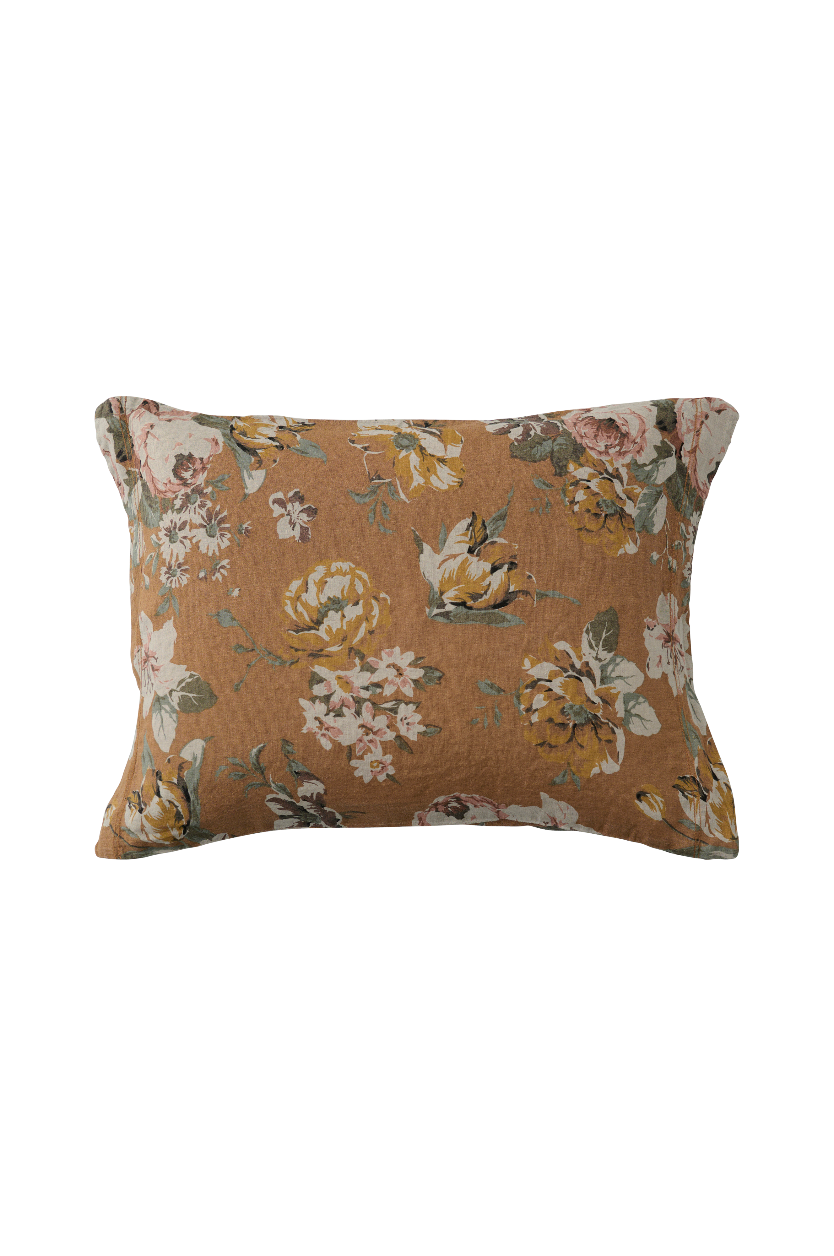 Tyynyliina vintagepestyä ranskalaista pellavaa. Painettu ruusukuvio pellavapohjalla. Koko 50x60 cm + 5 cm:n reunus lyhyillä sivuilla.