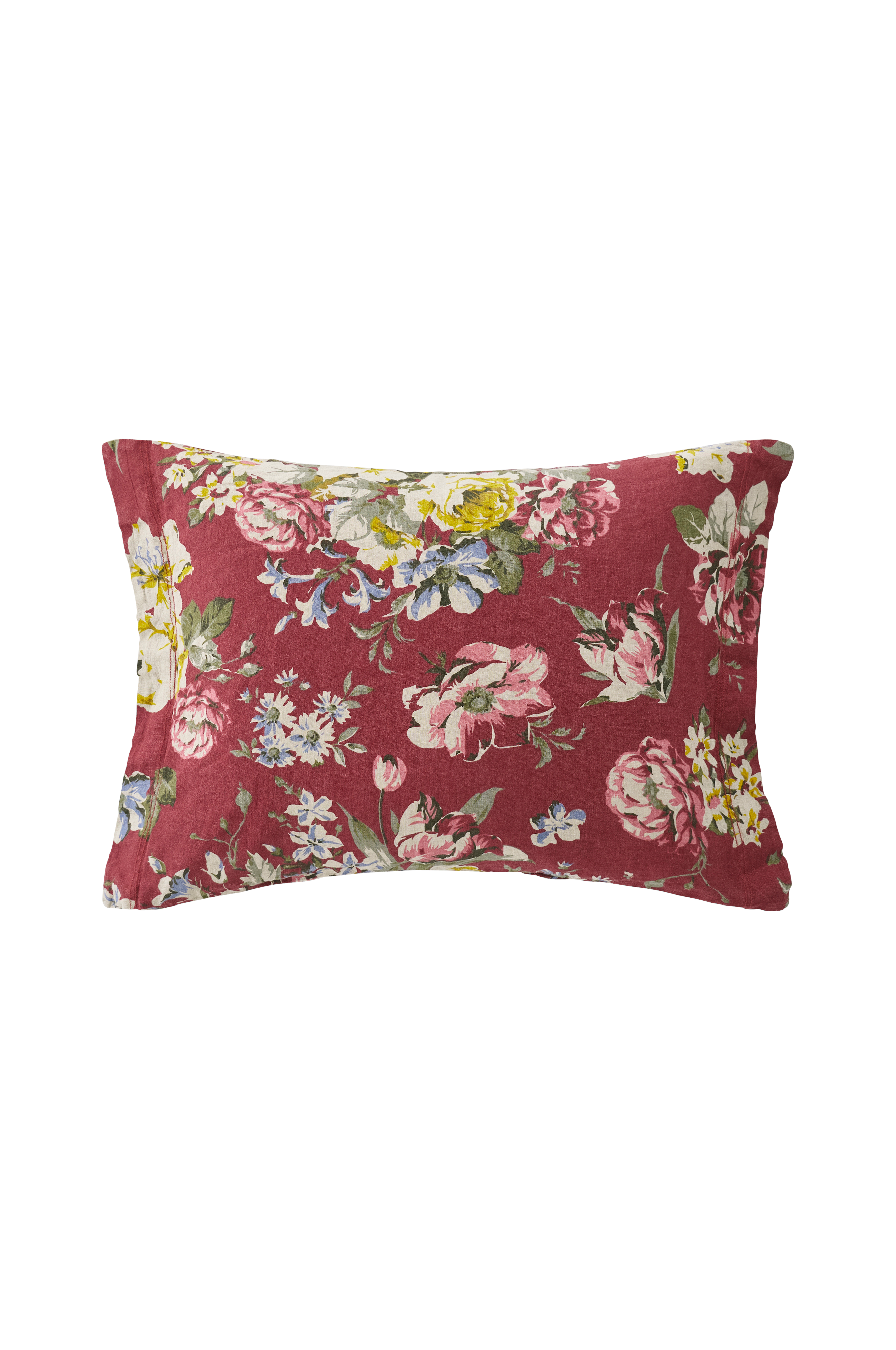 Tyynyliina vintagepestyä ranskalaista pellavaa. Painettu ruusukuvio pellavapohjalla. Koko 50x60 cm + 5 cm:n reunus lyhyillä sivuilla.
