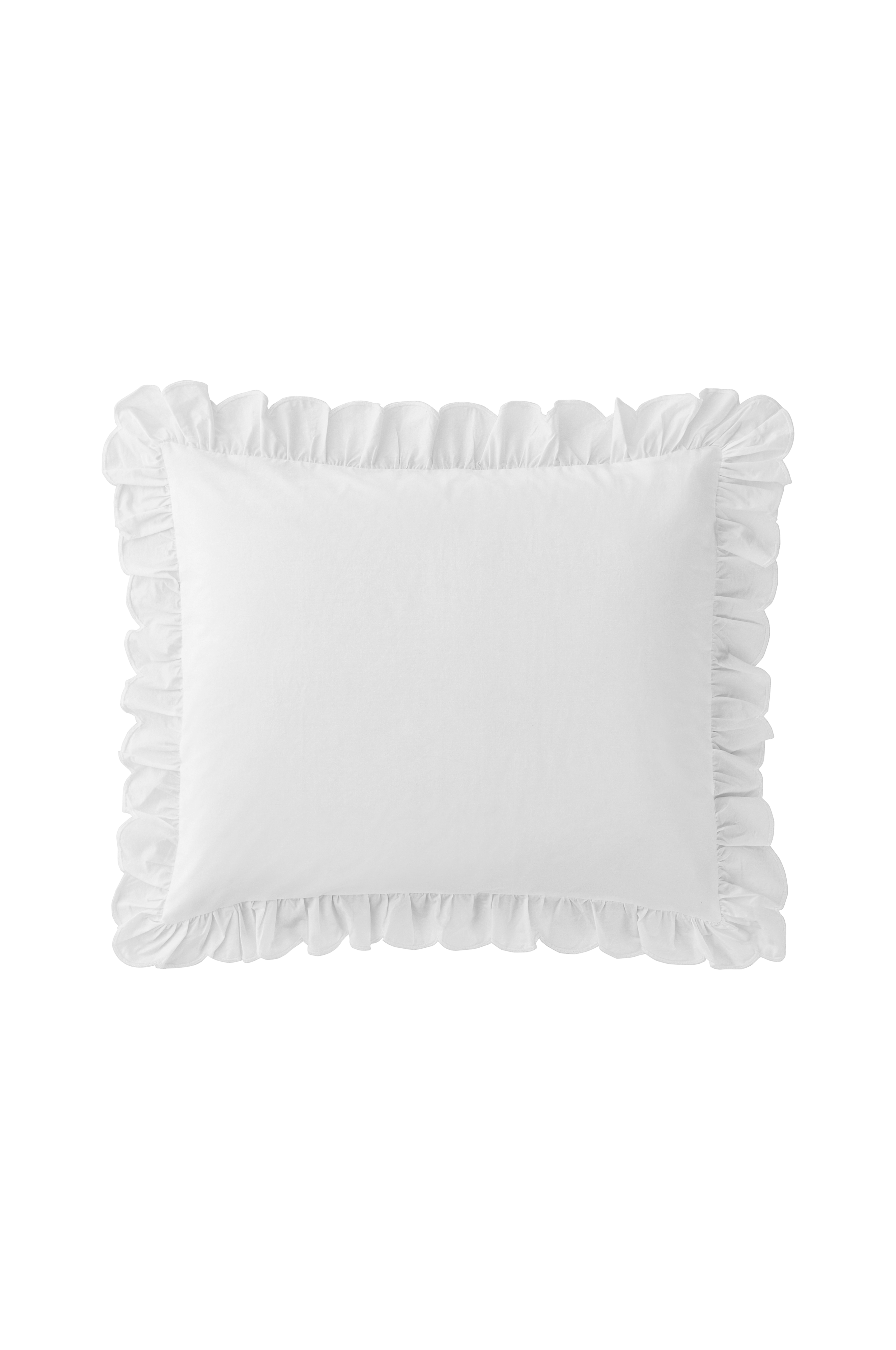 Tyynyliina pestyä puuvillaperkaalia. 6 cm:n aaltomainen röyhelöreuna ympäriinsä. Koristeellinen ommel viimeistelee ilmeen. Langantiheys 200 tc. Tuote toimitetaan samasta materiaalista valmistetussa kangaskassissa.