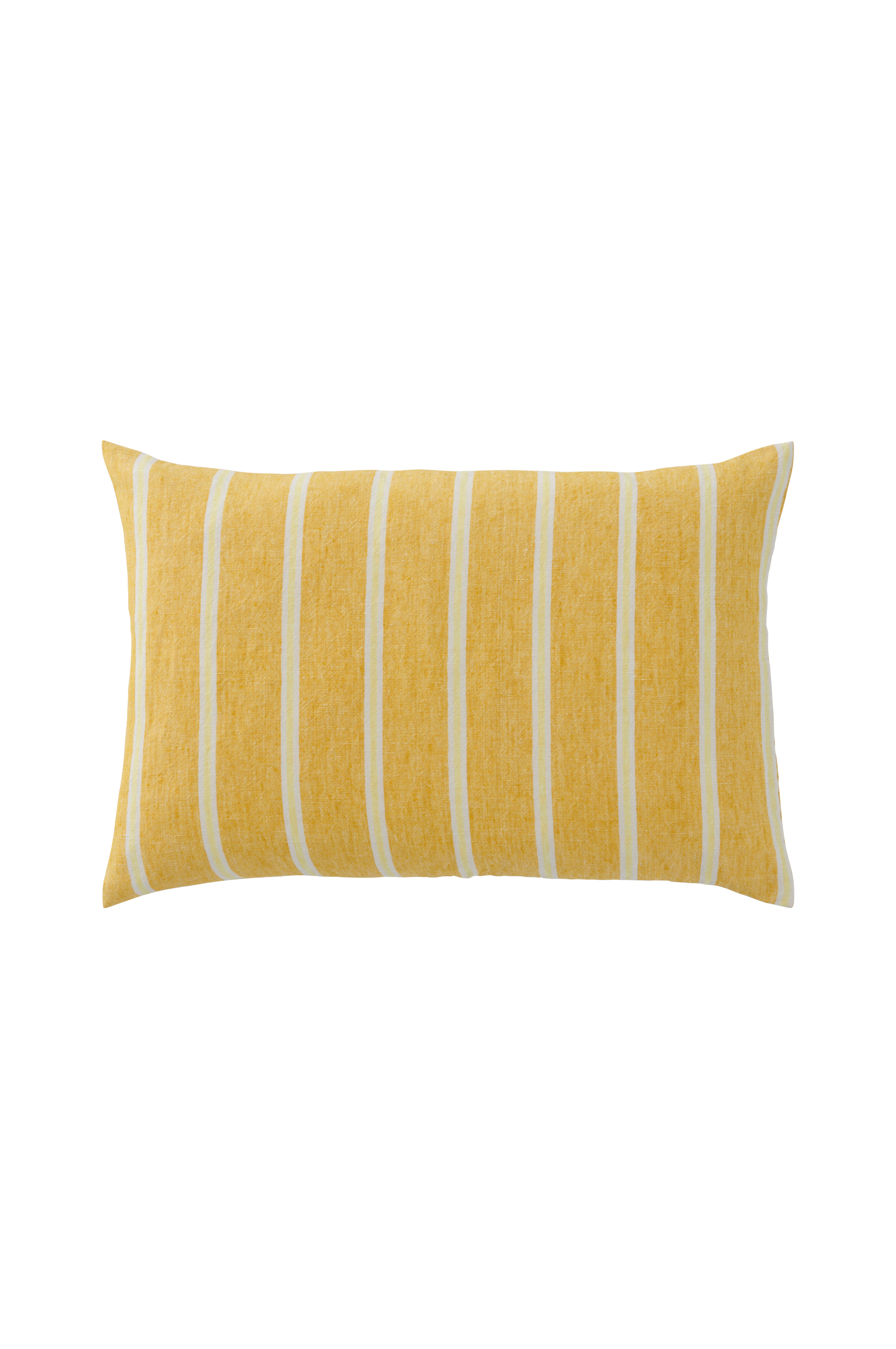 Tyynynpäällinen pehmeää pestyä ranskalaista pellavaa. Lankavärjätyt raidat. Vetoketju alareunassa.