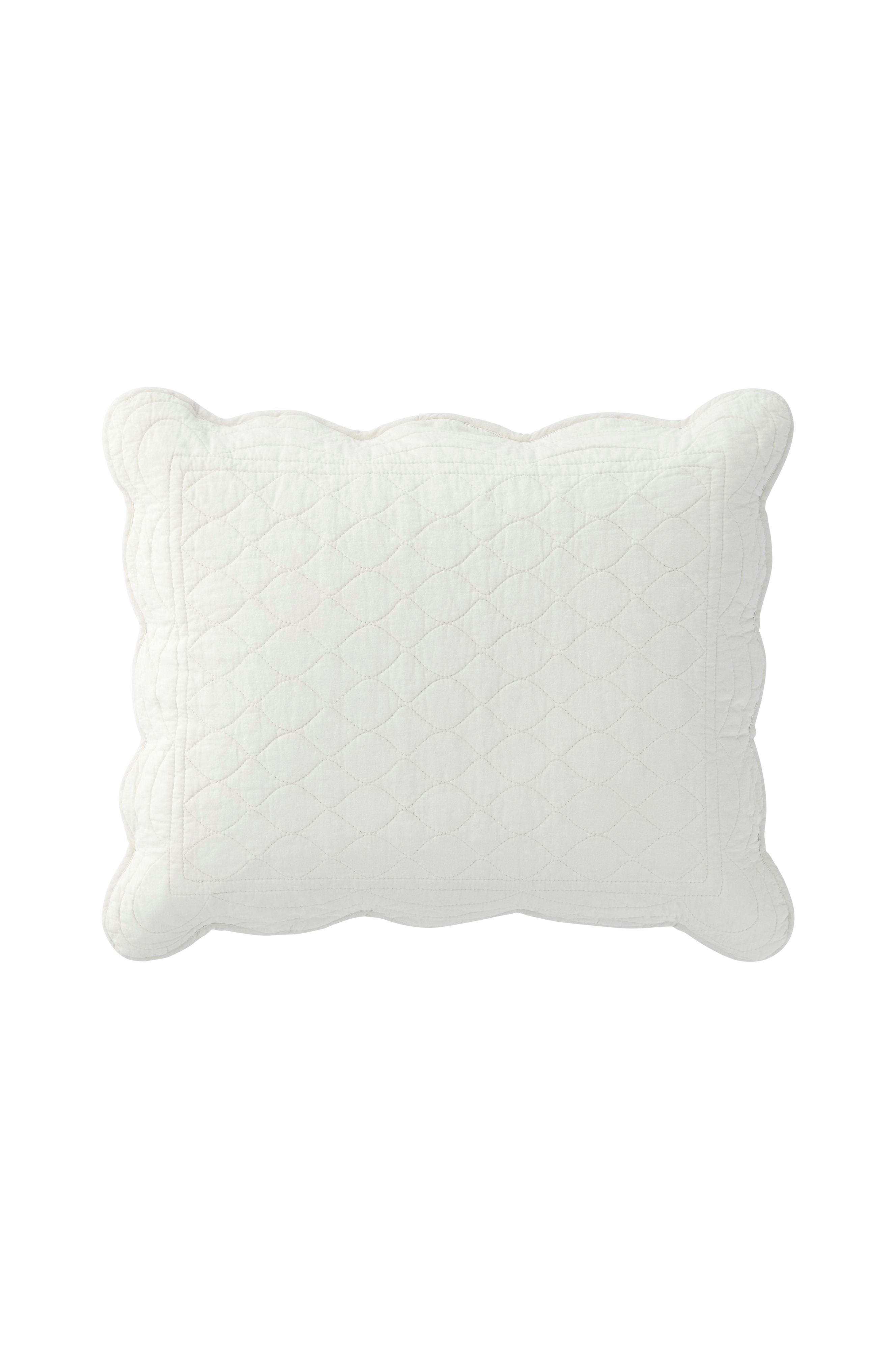 Tikattu, ohut tyynynpäällinen pestyä puuvillaa. Aaltomaiset reunat, joissa nauhareunus. Kirjekuorisuljenta (ei vetoketjua).