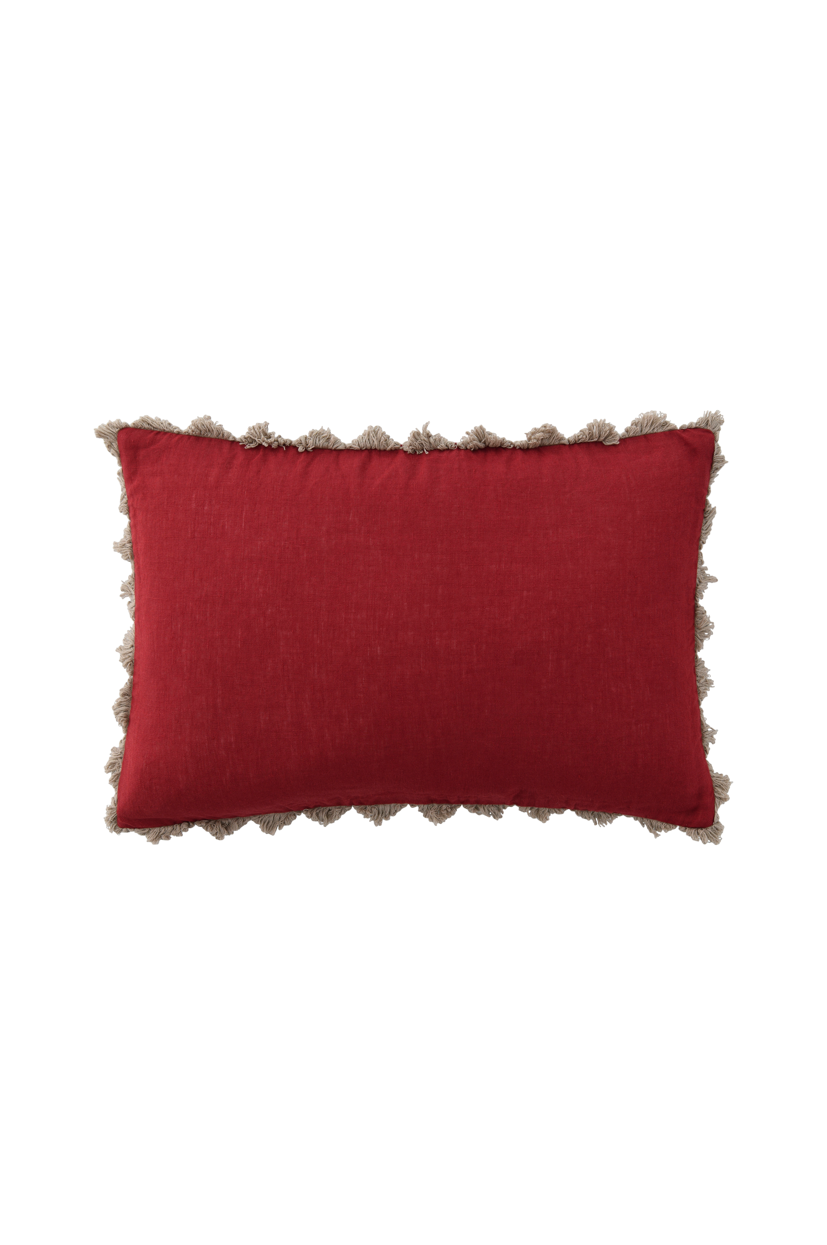 Tyynynpäällinen pellavaa. Koristeellinen lankareunus ympäriinsä. Molemmat sivut ovat yksiväriset. Piilovetoketju takana.