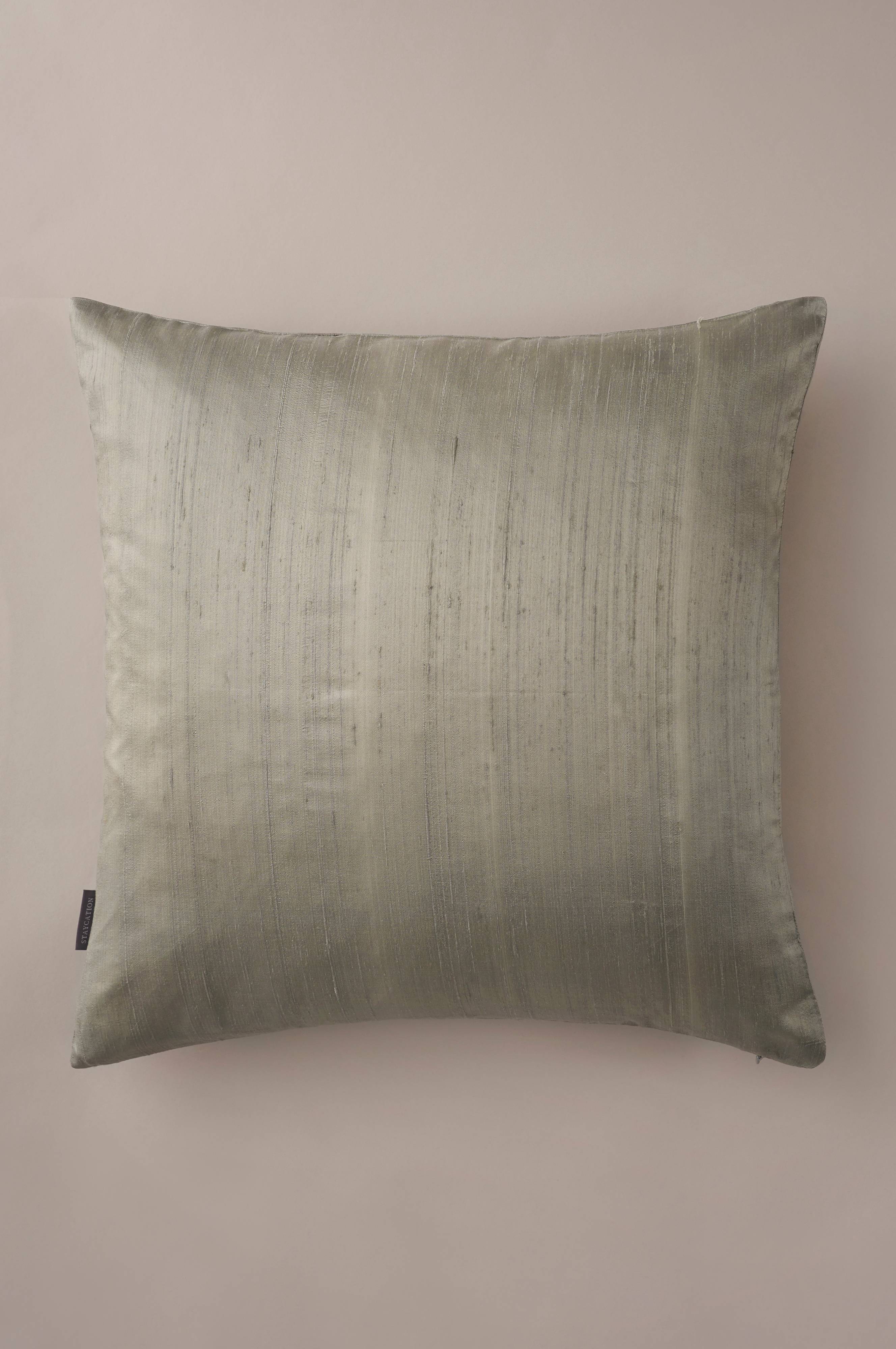 Yksivärinen tyynynpäällinen silkkiä, jossa kankainen etiketti sivulla. Alareunassa vetoketju. Koko 50x50 cm.