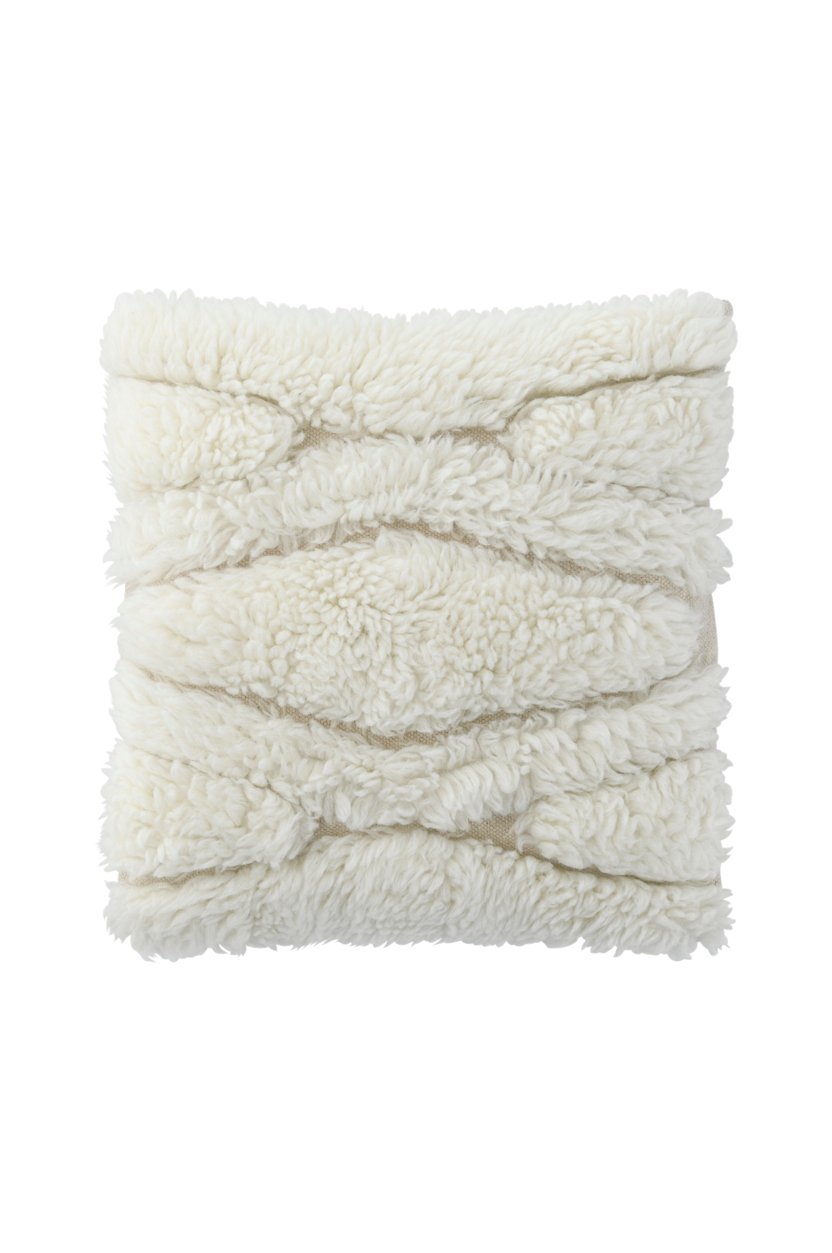 Tyynynpäällinen, jossa edessä tuftattu villainen kuvio. Pohja puuvillaa. Taustapuoli paksuhkoa puolipanamaa. Takana vetoketju.