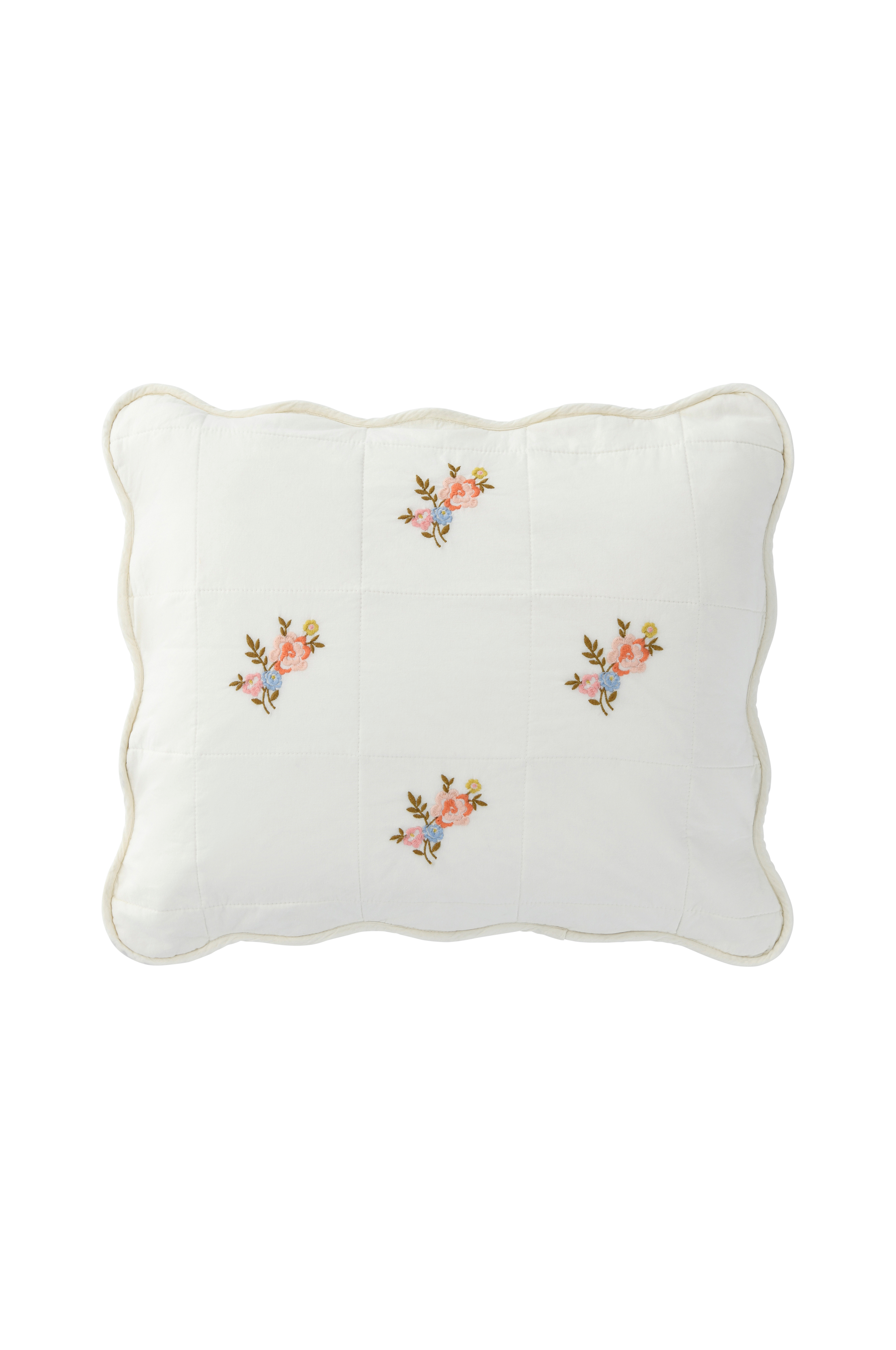 Tikattu tyynynpäällinen pestyä puuvillaa. Aaltomainen reuna ympäriinsä. Toisella puolella kirjailtuja kukkia ja toinen puoli on raidallinen.