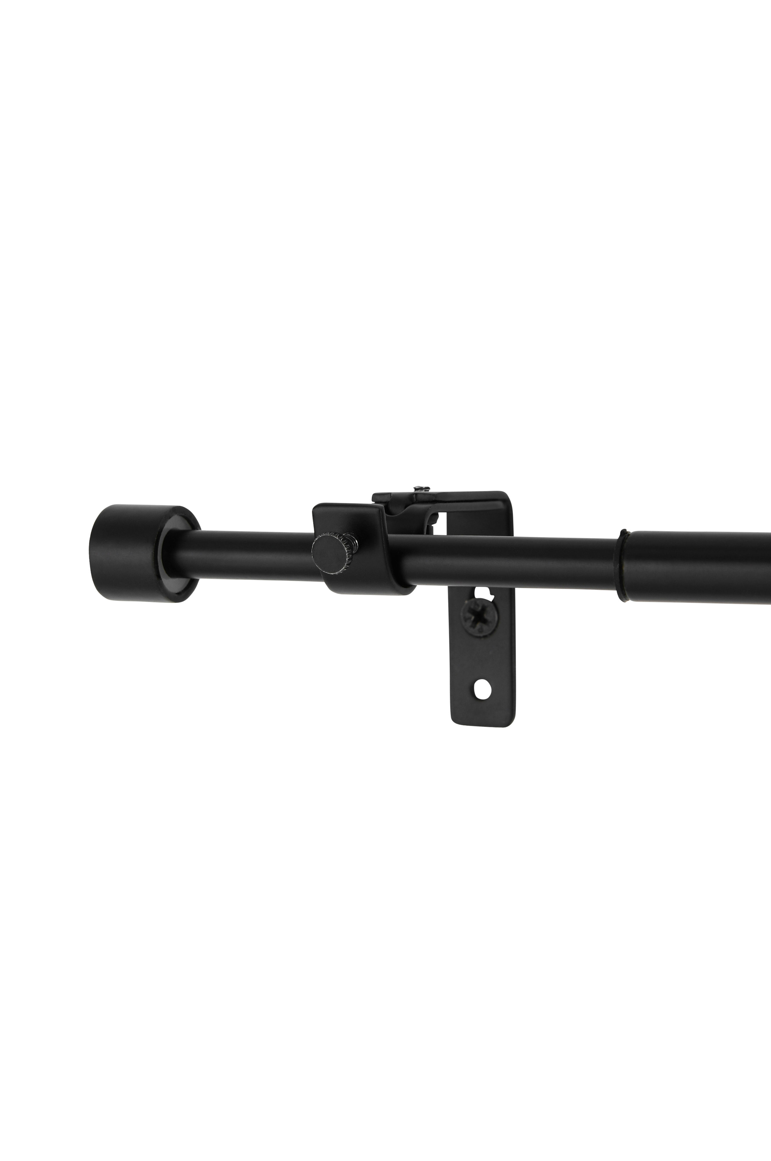 Täydellinen verhotankosetti mustaksi maalattua metallia. Setissä on 2 kapeaa putkea (halkaisija 9 mm) ja yksi paksu putki (halkaisija 12 mm), kaikkien pituus 67 cm. Säädettävä pituus n. 70-180 cm. Kaksi päätynuppia ja kolme seinäkiinnikettä.