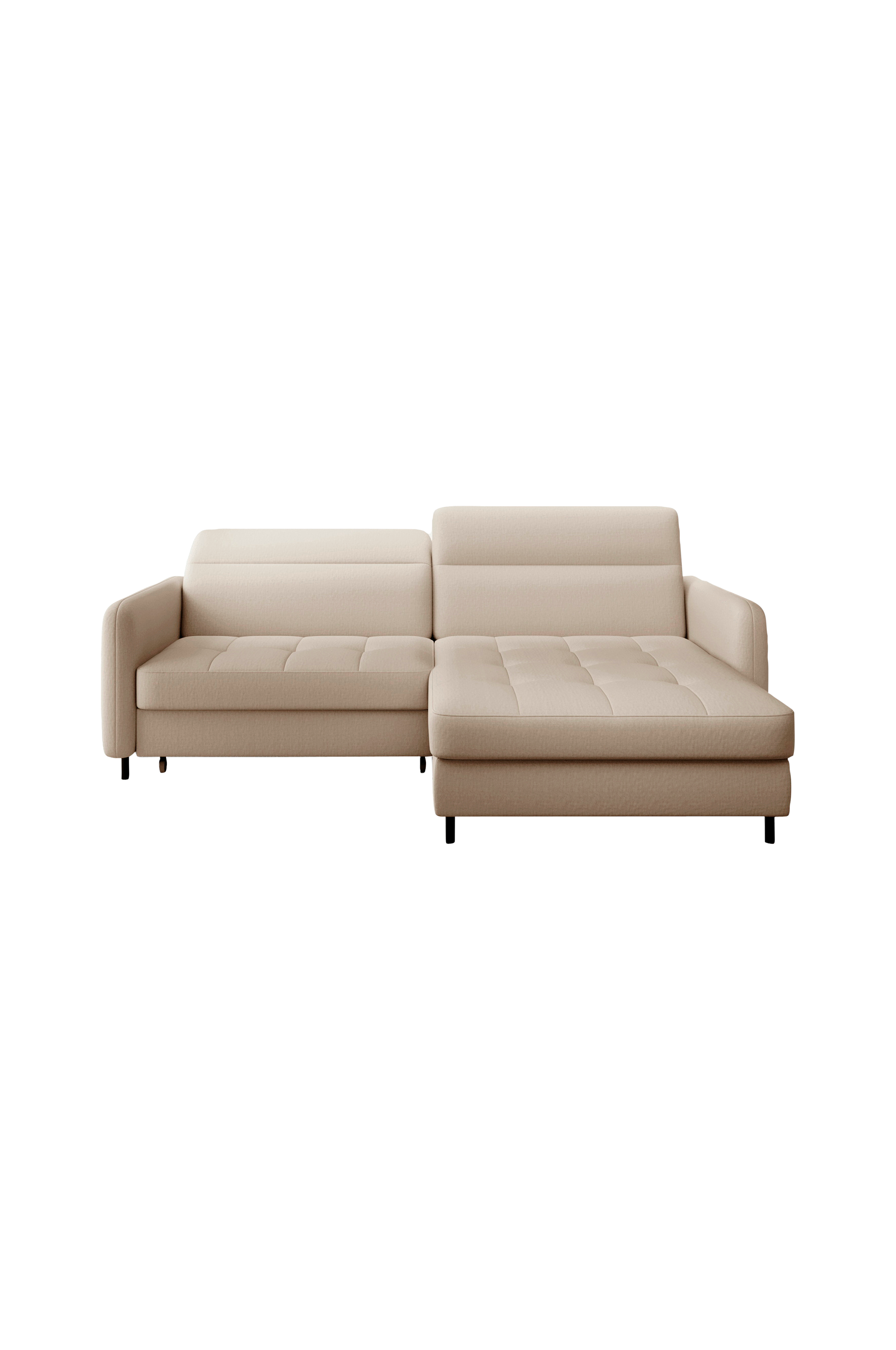 Gomsi-kulmasohva, jonka mitat ovat 228x165x100 senttimetriä, täydentää sisustusta täydellisesti. Tikatut istuimet ja mustat metallijalat antavat sille ainutlaatuisen ulkonäön, kun taas verhoiltu selkänoja tekee tuotteesta universaalin. Se sopii täydellisesti sekä moderniin että tyylikkääseen sisustukseen. 128x200 senttimetrin kokoisen nukkumatoiminnon ansiosta voit hengähtää ja rentoutua katsellessasi suosikkielokuviasi ja -sarjoja. Jokapäiväisen lepomukavuuden takaavat nukkumistoiminnon lisäksi istuimissa käytetyt erittäin joustava hr-vaahtomuovi ja korkealaatuiset b-tyypin aaltojouset, jotka antavat istuimille jousitusta. Toinen kätevä elementti on vuodevaatesäiliö, jonka mitat ovat 117x97x15 cm ja jonka avulla voit säilyttää ylimääräisiä peittoja, tyynyjä ja vuodevaatteita.